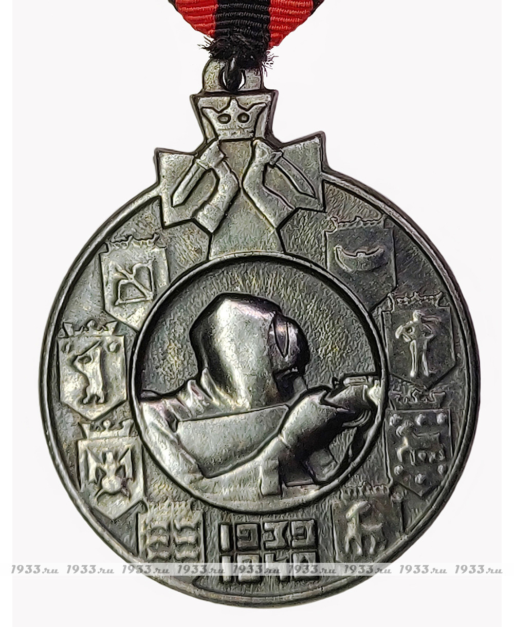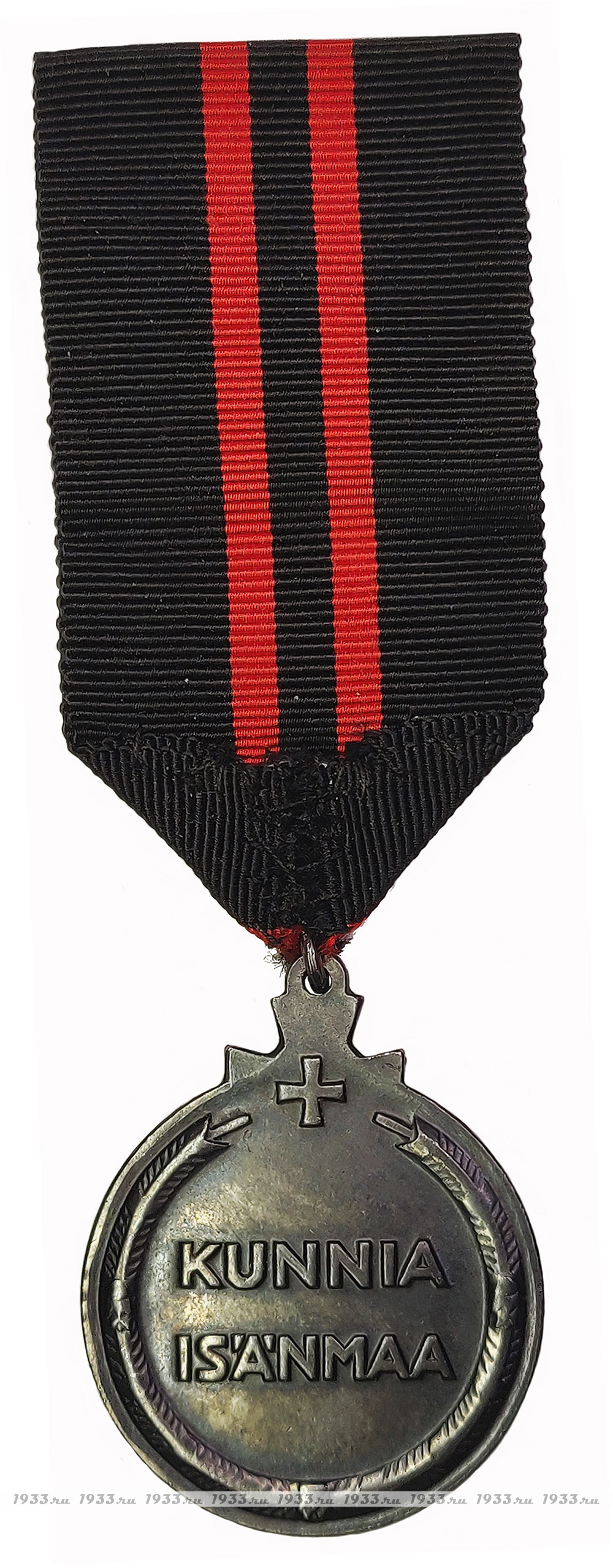 Учреждена 2 августа 1940 г. Медалью награждались военнослужащие, принимавшие участие в войне с СССР, зимой 1939-1940 года. Эта медаль не является БОЕВОЙ наградой, а чисто памятной! Лицевая сторона: финский солдат-снайпер («кукушка»), вокруг гербы финских городов губернь (Выппури-Выборг, Энсо-Советск и т.д.) и даты «1939-1940». Оборотная сторона: крест и надпись KUNNIA ISANMAA («Честь, Родина»). Финны (в том числе и сам Маннергейм) награждались железной медалью. Всего было выпущено 700 000 таких медалей. К медали выпускались планки. Всего их было 17 видов: 1. CANDIDO PRO CAUSA ENSE CANDIDO - с чистым мечем за правое дело. (На награде Маннергейма) 2. ISANMAA - Родина или Отчизна. На наградах у президента Kyosti Kallio и премьера, ставшего в последствии президентом - Ристо Рюти. ПО МЕСТАМ БОЕВ: 3. KARJALAN KANNAS («Карьялан Каннас») - Карельский перешеек 4. SUMMA («Сумма») - поселок в 35 километрах от Выборга 5. TAIPALE («Тайпале») - поселок на севере Карельского перешейка, недалеко от Ладоги 6. LAATOKAN KARJALA («Лаатокан-Карьяла») - Район Ладоги в Карелии 7. TOLVAJARVI («Толваярви») - Озеро Толва к северу от Ладоги 8. POHJOIS-KARJALA («Похьойс-Карьяла») - Северная Карелия 9. KAINUU («Кайнуу») - довольно большая область около Кухмо и Суомуссалми 10. SUOMUSSALMI («Суомуссалми») - Город в центре Финляндии 11. LAPPI («Лаппи») - Лапландия (часто получали шведы) 12. MANTSISSAARI («Мантсинсаари») - Остров на севере Ладоги к востоку от Валаам 13. KOIVISTO («Койвисто») - прибрежный поселок к югу от Выборга (50 км) ПО РОДАМ ВОЙСК: 14. KENTTAARMEIJA - общевойсковая 15. KOTIJOUKOT - ополчение 16. ILMAPUOLUSTUS - ПВО 17. RANNIKOPUOLUSTUS - береговая оборона. Самые редкие планки мест сражений, из них - Мантинсаари, Койвисто, Суомуссалми, Тайпале, далее фронтов (кроме Карельского перешейка), далее - планки родов войск, кроме RANNIKOPUOLUSTUS, она редкая. Мечи на ленту давали тем, кто непосредственно принимал участие в сражении. Наградные листы печатались на финском и шведском языке (шведский документ более редок) и были 3 типов. На финском языке: -sodan 1939-1940 muistomitalin - медаль -sodan 1939-1940 muistomitalin soljella - медаль с мечами -sodan 1939-1940 muistomitalin miekoilla ja soljella - медаль с мечами и планкой. Так же выпускалась Памятная Медаль Зимней войны 1939-40 для иностранных добровольцев. Они были большего диаметра (34 мм), изготовленными из железа (14 000), бронзы (около 3000), серебра (42) и золота (7). На реверсе таких наград изображен Финский геральдический лев и надпись по кругу - "Summo in Periculo Fautoribus Adiutoribus Finlandia Memor" (Памятная награда защитникам и патриотам Финляндии в ее великой опасности). Все награды были выпущены ООО Suomen Kultasepat. Клейма на золотых и серебренных медалях располагаются по гурту, как и на медалях ордена Белой Розы. Иностранные добровольцы так же награждались медалями с планками и мечами. По родам войск: - KENTTAARMEIJA - ILMAPUOLUSTUS - KOTIJOUKOT По местам боев: - LAPPI - KARJALAN KANNAS