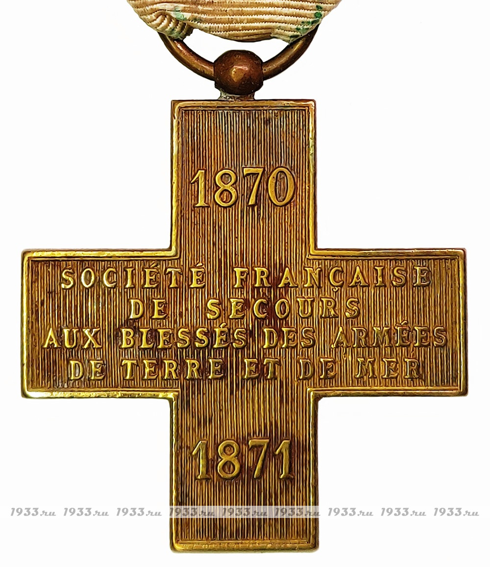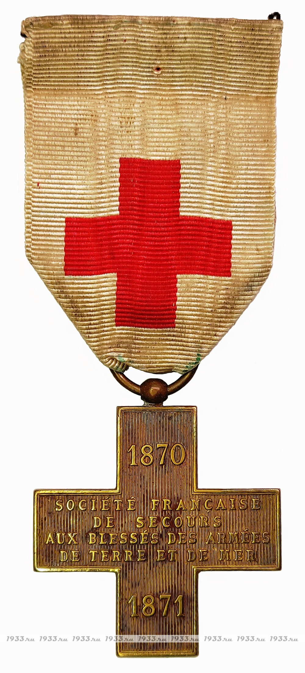 Учреждён в 1864 году, и упразднён в 1940 году, в связи с оккупацией Германией. Общество помощи раненым военнослужащим было создано в 1864 после подписания Женевского Соглашения (1863). В 1866 г. было признано общественно полезным. Его деятельность распространилась на Францию и Колонии, именно ее транспорт - "Скорая помощь" в войне 1870-1871 сделали ее знаменитой. Его добровольные члены - врачи, братья христианских школ, сестры милосердия, добровольцы - мужчины и женщины, предоставленные Корпусу Военной Санитарии, сделали популярным Красный Крест, который был их знаком. Эти медали создавали как общественные награды и выдавались только регулярным членам. Комитет находился под председательством НАПОЛЕОНА III и министров Войны и Флота, эти последние были представлены в Совете директоров Общества. Это Общество наиболее раннее, но в 1879 была создана АССОЦИАЦИЯ ФРАНЦУЗСКИХ ДАМ и в 1882 - СОЮЗ ЖЕНЩИН ФРАНЦИИ, награды которых тоже известны. Именно эти три Общества, работающие для отдела Военной Санитарии, образовали ФРАНЦУЗСКИЙ КРАСНЫЙ КРЕСТ. Накануне войны 1914-1918, численность этих обществ была следующей: 5000 - первого, 36000 - второго и 37000 – третьего, распределенного по 148 комитетам в городах. НАГРАДЫ ОБЩЕСТВА ПОМОЩИ РАНЕНЫМ ВОЕННОСЛУЖАЩИМ. Известно четыре модели: - ПЕРВАЯ (датированная 1864-1866) - круглая медаль 16 мм из посеребрённого металла. На аверсе изображение женщины на фоне красного креста, которая поддерживает раненного в голову кирасира. Легенда - "РОДИНА - САМООТВЕРЖЕННОСТЬ". На реверсе надпись "ФРАНЦУЗСКОЕ ОБЩЕСТВО ПОМОЩИ ВОЕННЫМ РАНЕНЫМ 1864-1866". Эта медаль имеет навершие в виде рамки с инициалами "S.B.", а выше рамки - лавровый венок, соединенный с широким подвесом; - ВТОРАЯ - односторонний крест из светлой бронзы на фоне с черточками надпись «ФРАНЦУЗСКОЕ ОБЩЕСТВО ПОМОЩИ РАНЕНЫМ СУХОПУТНЫХ И МОРСКИХ СИЛ 1870-1871», на некоторых экземплярах имеется имя владельца и его город проживания; - ТРЕТЬЯ идентична второй, но крест двусторонний и его надпись распределена на обе стороны. Существуют серебряные кресты. - ЧЕТВЕРТАЯ - периода 1 Мировой войны 1914-1918. У него форма креста из металла, иногда посеребренного. На аверсе надпись «1914-SBM-1919» с дубовым венком, а на реверсе - полное название Общества.