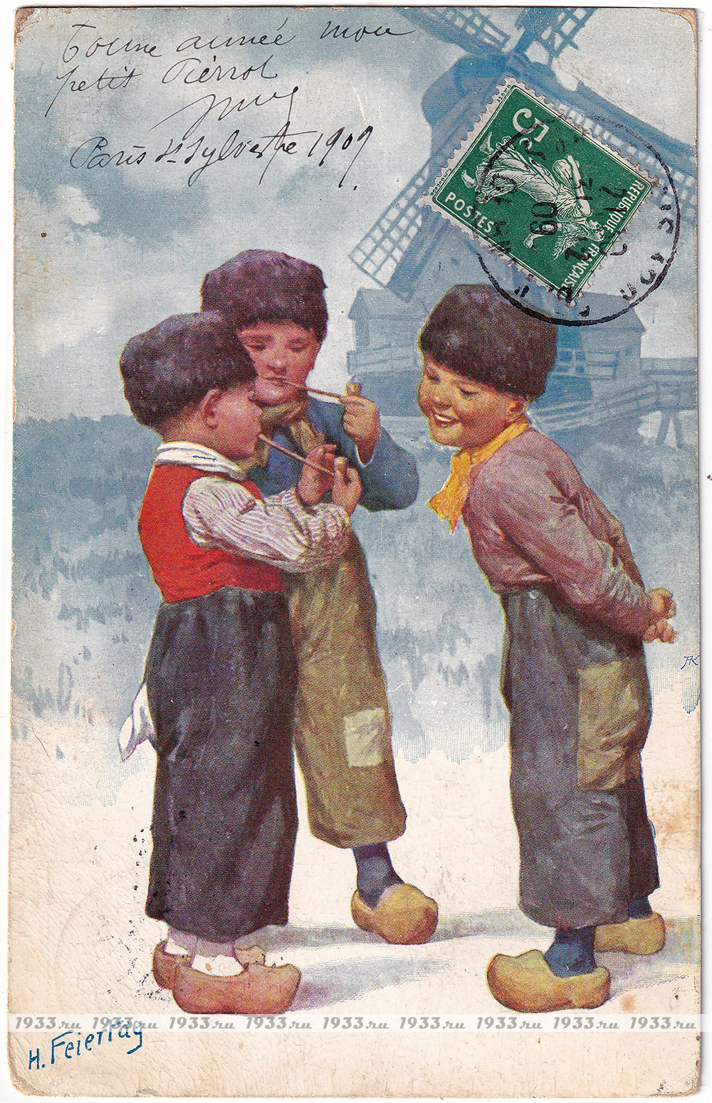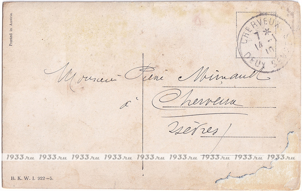 Отпечатано в Австрии. Офсетная цветная печать. Открытка прошла почту во Франции. Оборот подписан. На лицевой стороне почтовая стандартная марка Франции со штампом отправления от 31.12.1909 года и штампом прибытия 14,01.1910 г.
