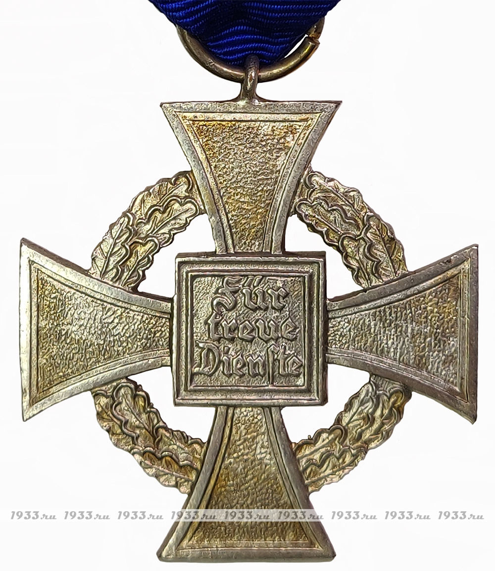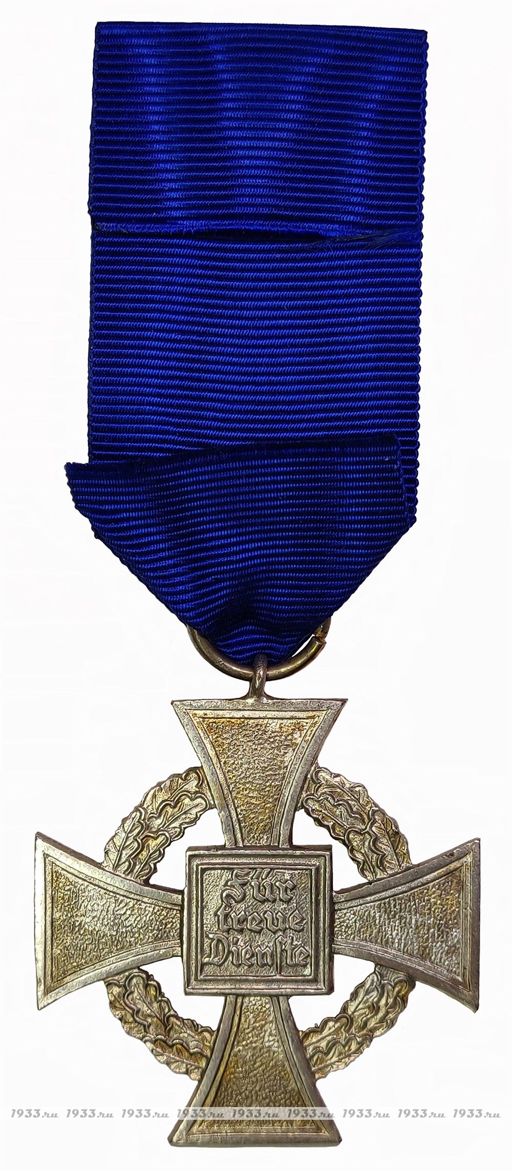 Учрежден 30 января 1938 г. для награждения должностных лиц и работников государственной службы. Награда выполнена по эскизу Richard Klein`a. На реверсе надпись "За верную службу". После окончания Второй мировой войны НСДАП объявили вне закона и запретили все ее символы. Как следствие этого, под запретом оказалось ношение всех наград Третьего рейха, поскольку практически все они в числе элементов, составляющих их художественное оформление, имели свастику. 26 июля 1957 года западногерманское правительство приняло закон "О денацификации". Было официально разрешено носить ордена, медали и значки попавшие под действие этого закона. Награды в новом исполнении в основном повторяли свой первоначальный вид за исключением удаленных символов нацизма, причем кое-где исчезла не только свастика но и имперский орел. Последнее касалось в основном военных значков армии и ВМФ. Золотой значок НСДАП, Орден Крови, партийные и эсэсовские знаки остаются под запретом и по сей день из-за их явно нацистского содержания. Эта же участь постигла Испанский крест, Кресты матери (что несколько странно), значки Гитлерюгент, медали СС (например, "За верную службу") и некоторые другие награды, которые сочли скорее нацистскими чем немецкими.