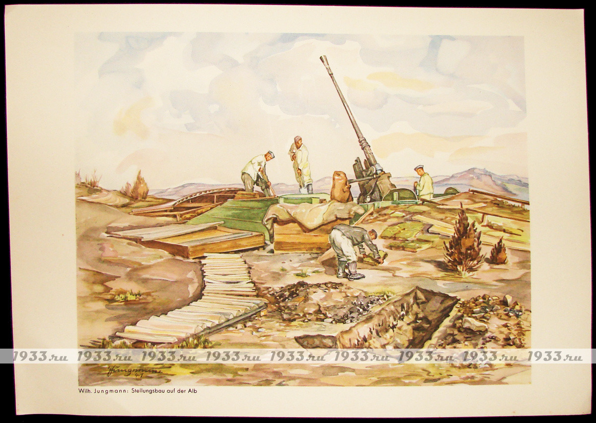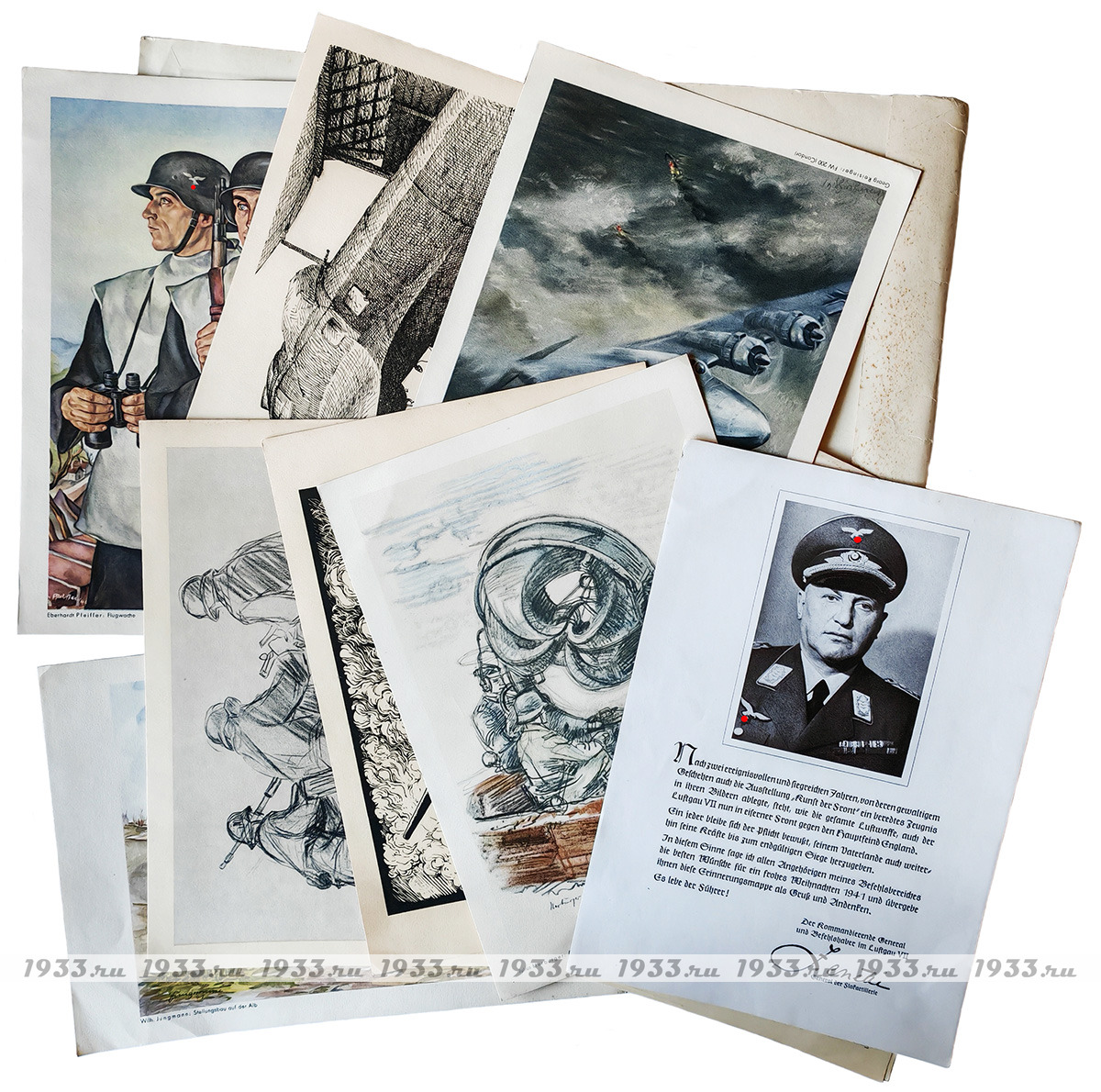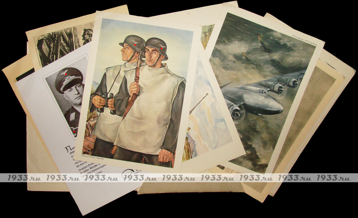 В папке: лист с Рождественским поздравлением от командующего VII LUFTGAU; 12 графических и акварельных рисунков разных авторов-фронтовиков, с различных фронтов Второй Мировой войны.