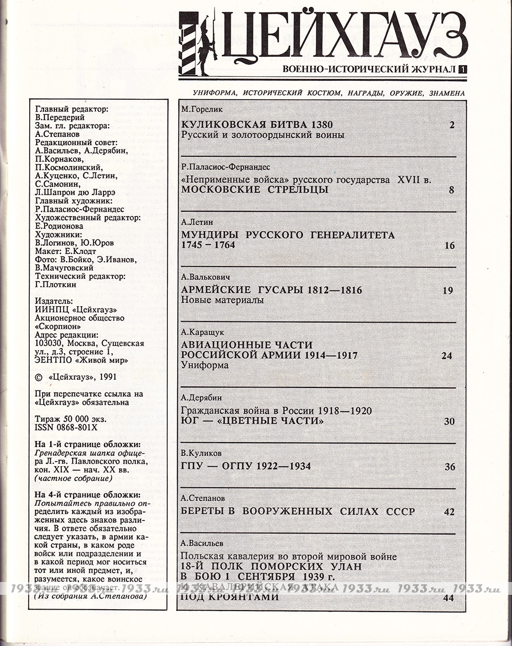 info@1933.ruВОЕННО-ИСТОРИЧЕСКИЙ ЖУРНАЛ "ЦЕЙХГАУЗ" № 1 - 1991 г. Назад в каталог