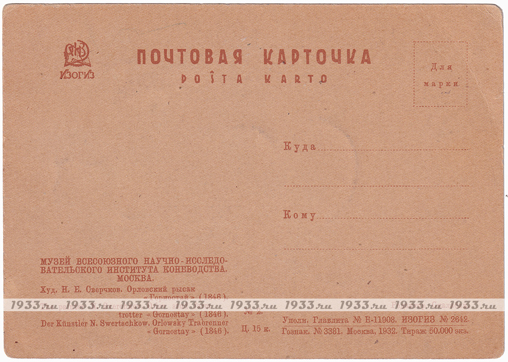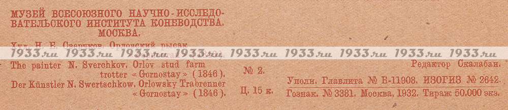 info@1933.ruСССР. ХУДОЖНИК Н.Е.СВЕРЧКОВ "ОРЛОВСКИЙ РЫСАК "ГОРНОСТАЙ"(1846)" Назад в каталог