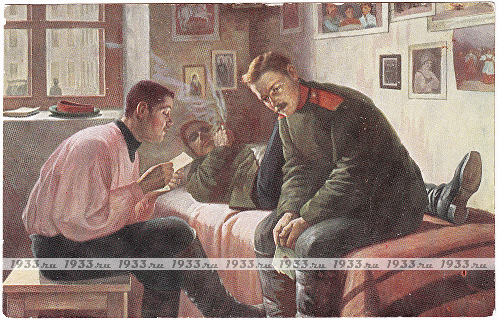 Помещение с белеными стенами скудно обставлено, на простой кровати лежит грубое солдатское одеяло, а стены украшены картинками, вырезанными из журналов, бумажными иконами и фотографиями, присланными родными. Из окна виден внутренний плац, со всех сторон окруженный такими же безликими белесыми казармами. Жизнь солдата в те времена была тяжким бременем, ведь «забривали» примерно на 7 лет, а это означало для семейного мужчины расставание с родными и близкими, детьми на долгий срок — оставив ребенка грудничком, он возвращался домой и становился для ребенка незнакомцем, ведь основные годы становления малыша прошли без отца. А ведь веком раньше срок службы был 25 лет, а до этого — и вовсе пожизненным! Судя по выражению лица солдата, сидящего на кровати, письмо адресовано ему и новости с родины совсем неутешительные.