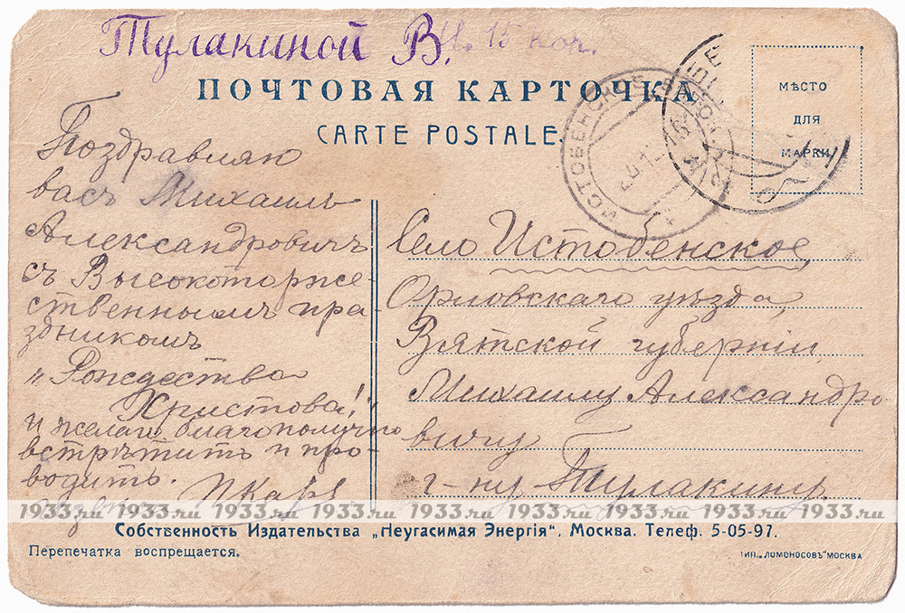 Открытка прошла почту. На обороте поздравление с Рождеством. Следы бытования. На правом углу след от перегиба. Очень хорошее состояние.