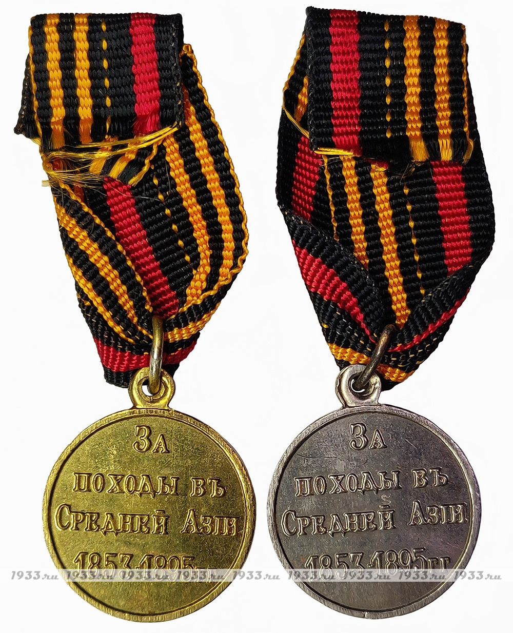 РОССИЙСКАЯ ИМПЕРИЯ. ФРАЧНИКИ СЕРЕБРЯНОЙ И БРОНЗОВОЙ МЕДАЛИ "ЗА ПОХОДЫ В СРЕДНЕЙ АЗИИ, С 1853 ПО 1895 Г.Г.", НА ЛЕНТАХ. КОПИЯ!