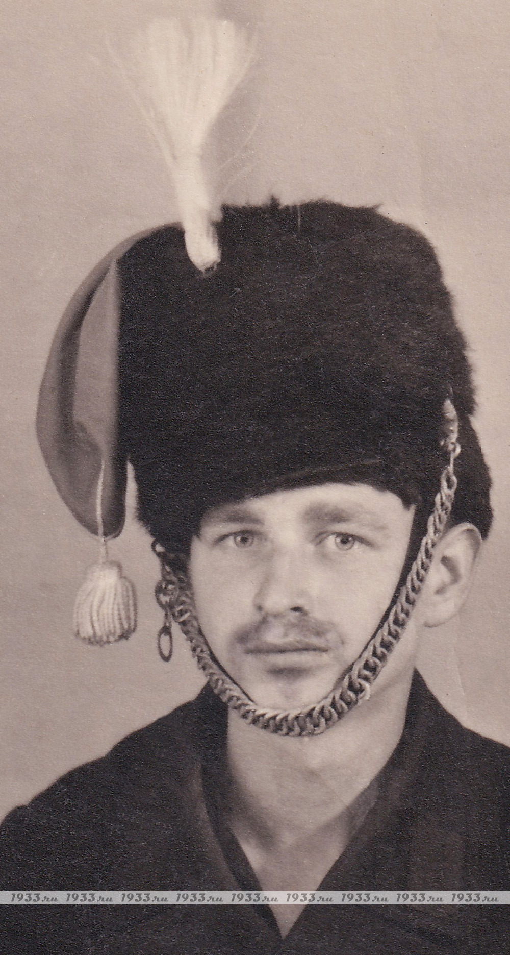 Антуражная фотография трех моряков. Центральный персонаж одет в реквизитную шапку и с палашом и награждён знаком "Минный тральщик".