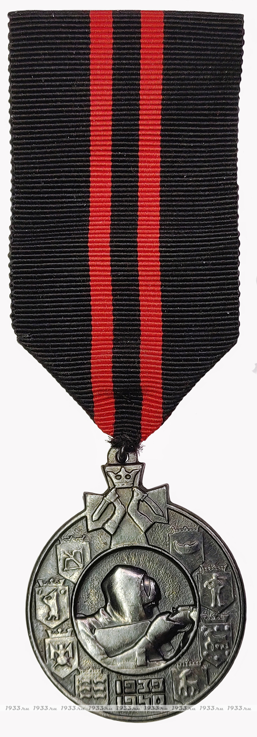 Учреждена 2 августа 1940 г. Медалью награждались военнослужащие, принимавшие участие в войне с СССР, зимой 1939-1940 года. Эта медаль не является БОЕВОЙ наградой, а чисто памятной! Лицевая сторона: финский солдат-снайпер («кукушка»), вокруг гербы финских городов губернь (Выппури-Выборг, Энсо-Советск и т.д.) и даты «1939-1940». Оборотная сторона: крест и надпись KUNNIA ISANMAA («Честь, Родина»). Финны (в том числе и сам Маннергейм) награждались железной медалью. Всего было выпущено 700 000 таких медалей. К медали выпускались планки. Всего их было 17 видов: 1. CANDIDO PRO CAUSA ENSE CANDIDO - с чистым мечем за правое дело. (На награде Маннергейма) 2. ISANMAA - Родина или Отчизна. На наградах у президента Kyosti Kallio и премьера, ставшего в последствии президентом - Ристо Рюти. ПО МЕСТАМ БОЕВ: 3. KARJALAN KANNAS («Карьялан Каннас») - Карельский перешеек 4. SUMMA («Сумма») - поселок в 35 километрах от Выборга 5. TAIPALE («Тайпале») - поселок на севере Карельского перешейка, недалеко от Ладоги 6. LAATOKAN KARJALA («Лаатокан-Карьяла») - Район Ладоги в Карелии 7. TOLVAJARVI («Толваярви») - Озеро Толва к северу от Ладоги 8. POHJOIS-KARJALA («Похьойс-Карьяла») - Северная Карелия 9. KAINUU («Кайнуу») - довольно большая область около Кухмо и Суомуссалми 10. SUOMUSSALMI («Суомуссалми») - Город в центре Финляндии 11. LAPPI («Лаппи») - Лапландия (часто получали шведы) 12. MANTSISSAARI («Мантсинсаари») - Остров на севере Ладоги к востоку от Валаам 13. KOIVISTO («Койвисто») - прибрежный поселок к югу от Выборга (50 км) ПО РОДАМ ВОЙСК: 14. KENTTAARMEIJA - общевойсковая 15. KOTIJOUKOT - ополчение 16. ILMAPUOLUSTUS - ПВО 17. RANNIKOPUOLUSTUS - береговая оборона. Самые редкие планки мест сражений, из них - Мантинсаари, Койвисто, Суомуссалми, Тайпале, далее фронтов (кроме Карельского перешейка), далее - планки родов войск, кроме RANNIKOPUOLUSTUS, она редкая. Мечи на ленту давали тем, кто непосредственно принимал участие в сражении. Наградные листы печатались на финском и шведском языке (шведский документ более редок) и были 3 типов. На финском языке: -sodan 1939-1940 muistomitalin - медаль -sodan 1939-1940 muistomitalin soljella - медаль с мечами -sodan 1939-1940 muistomitalin miekoilla ja soljella - медаль с мечами и планкой. Так же выпускалась Памятная Медаль Зимней войны 1939-40 для иностранных добровольцев. Они были большего диаметра (34 мм), изготовленными из железа (14 000), бронзы (около 3000), серебра (42) и золота (7). На реверсе таких наград изображен Финский геральдический лев и надпись по кругу - "Summo in Periculo Fautoribus Adiutoribus Finlandia Memor" (Памятная награда защитникам и патриотам Финляндии в ее великой опасности). Все награды были выпущены ООО Suomen Kultasepat. Клейма на золотых и серебренных медалях располагаются по гурту, как и на медалях ордена Белой Розы. Иностранные добровольцы так же награждались медалями с планками и мечами. По родам войск: - KENTTAARMEIJA - ILMAPUOLUSTUS - KOTIJOUKOT По местам боев: - LAPPI - KARJALAN KANNAS