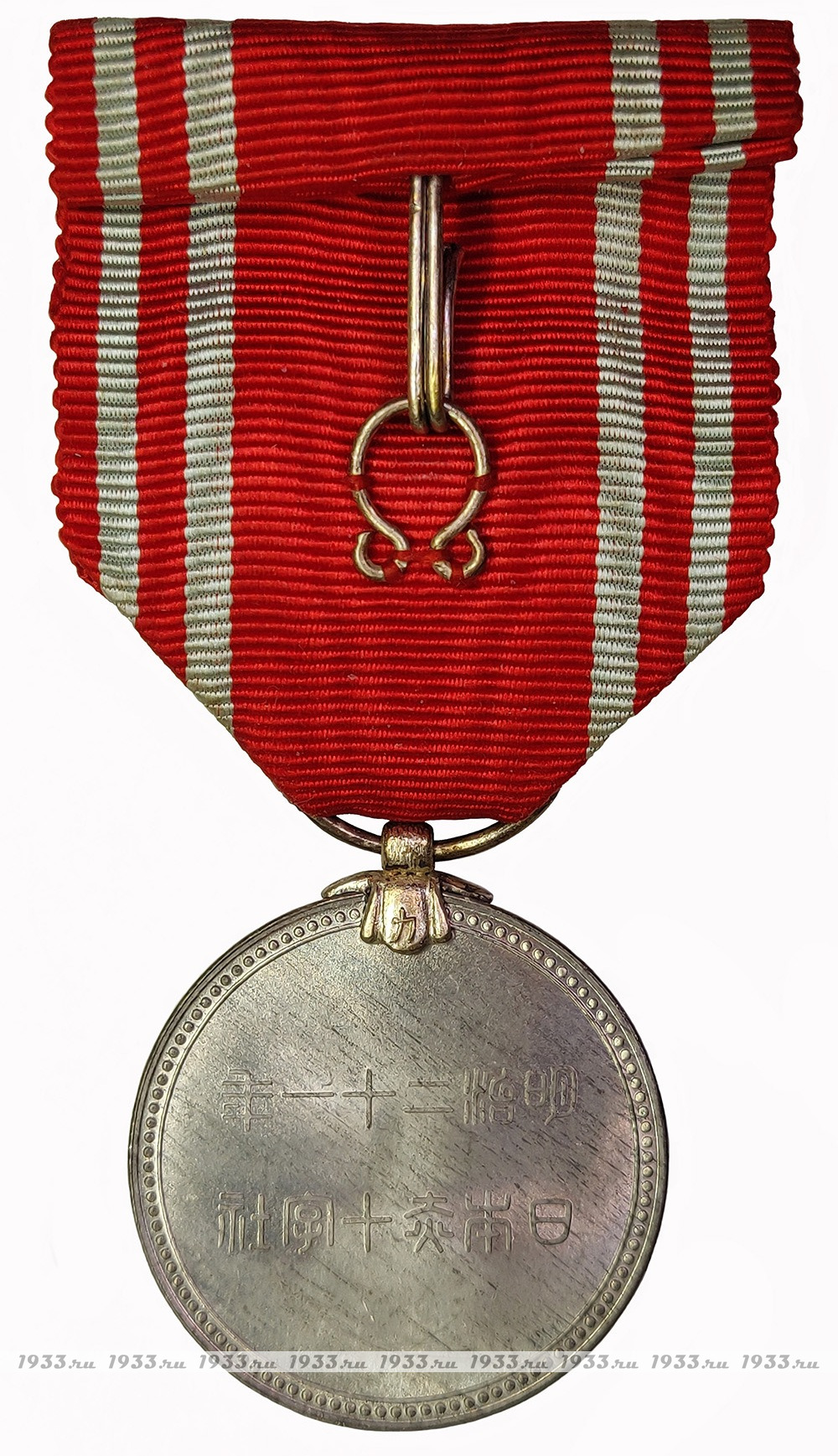 На лицевой стороне прикреплена синяя розетка (обозначение «Специального» или «Особого» члена Японского Общества Красного Креста).