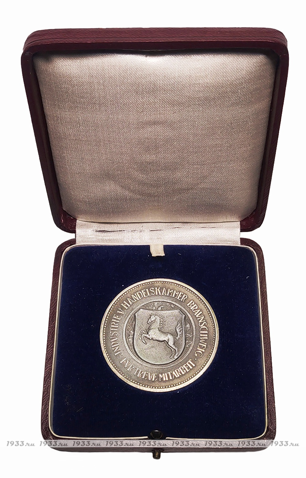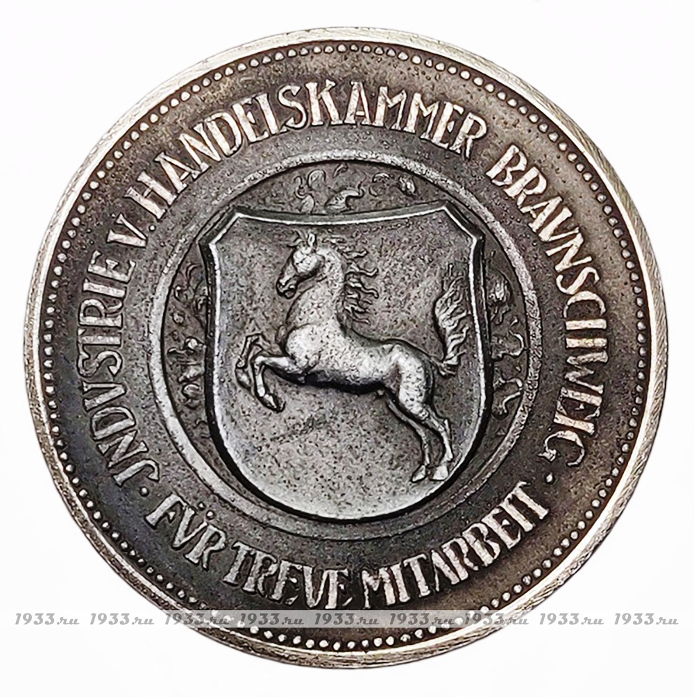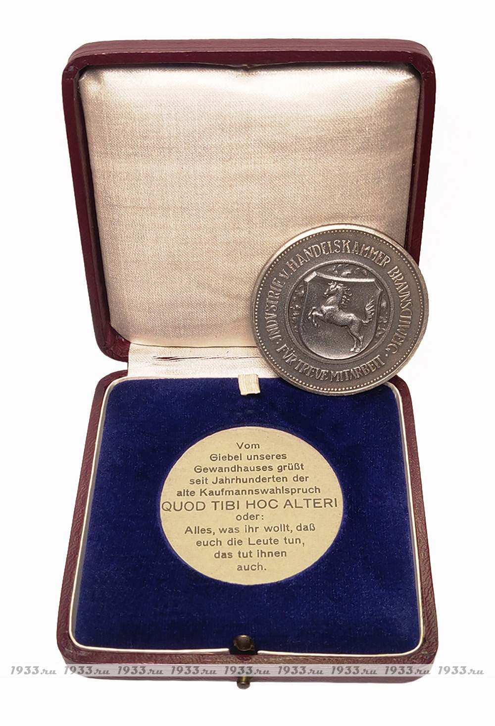 Íà àâåðñå ìåäàëè ãåðá Çåìëè Íèæíÿÿ Ñàêñîíèÿ (çíàìåíèòàÿ ñàêñîíñêàÿ ëîøàäêà), êóäà âõîäèë Áðàóíøâåéã. Íà ðåâåðñå èçîáðàæåí ñòàðèííûé äîì, íàõîäèâøèéñÿ íà ñòàðîé ðûíî÷íîé ïëîùàäè ãîðîäà Áðàóíøâåéãà, ãäå ñ 1910 ãîäà íà âåðõíèõ ýòàæàõ íàõîäèëàñü "IHK". Íàä îäíîì èç ôàñàäîâ áûëà èçîáðàæåíà è óêàçàííàÿ íàäïèñü íà ëàòûíè "Quod tibi hoc alteri" - "×òî äëÿ òåáÿ, òî è äëÿ äðóãèõ". Ìåäàëè îòëè÷àþòñÿ íàäïèñÿìè íà ðåâåðñå: äî 1918 ã. Òîðãîâàÿ ïàëàòà ãåðöîãñòâà Áðàóíøâåéã; äî 1924 ã. - Òîðãîâàÿ ïàëàòà Áðàóíøâåéã; äî 1933 ã. - Èíäóñòðèàëüíàÿ è òîðãîâàÿ ïàëàòà Áðàóíøâåéã.