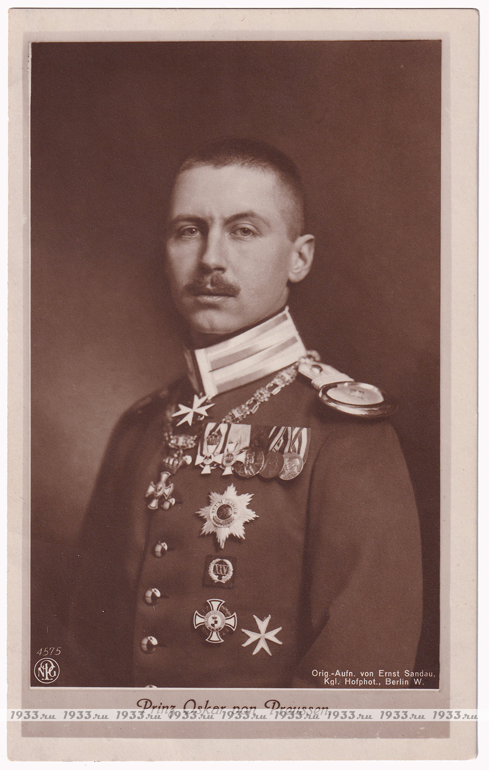 ПРИНЦ ОСКАР КАРЛ ГУСТАВ АДОЛЬФ - пятый сын немецкого императора Вильгельма 2 (родился 27.07.1888 г., Мраморный дворец, Потсдам - умер 27.01.1958 г., Мюнхен), генерал-майор германской армии и 35-й херренмейстер ордена Иоаннитов. Был политическим оппонентом нацистов. Сумел воспрепятствовать попыткам нацистов уничтожить орден. С 1932 г. он стал членом совета директоров Немецкой национальной народной партии. К началу Второй мировой войны имел звание генерал-майора, однако под давлением Гитлера подал в отставку».