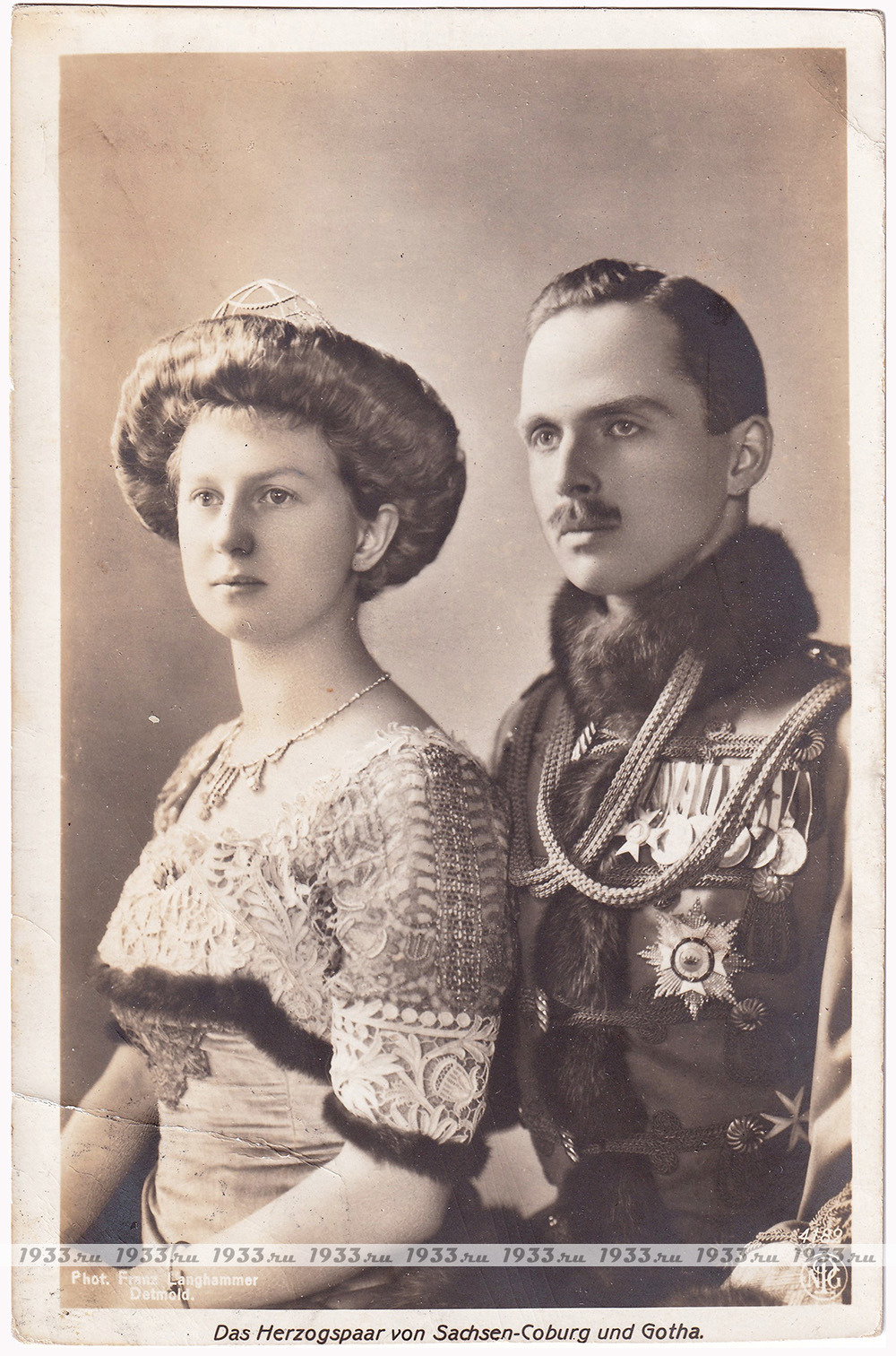 На фотографии Карл-Эдуард фон-Саксен-Кобург-Готский, (1884–1954 г.г.), герцог, (президент Немецкого Красного Креста) и его супруга - принцесса Виктория Адельгейде Шлезвиг-Гольштейн-Зондербург-Глюксбургская, родственница немецкой императрицы Августы Виктории.