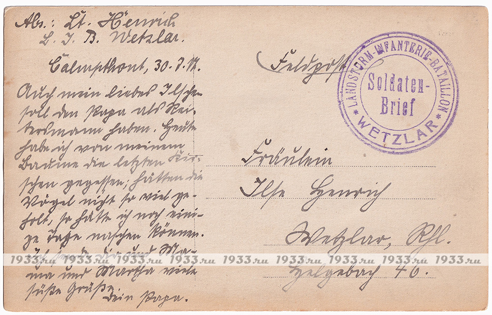 Солдатская почта(фельдпост). Штемпель пехотного батальона ландштурма города Вецлар. На обороте письмо с датой 30 июля 1917 года.