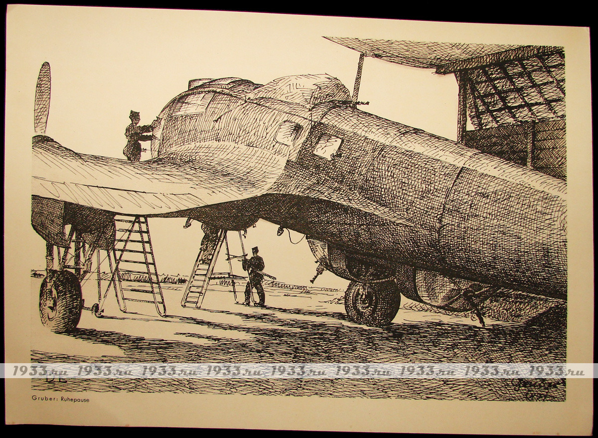 В папке: лист с Рождественским поздравлением от командующего VII LUFTGAU; 12 графических и акварельных рисунков разных авторов-фронтовиков, с различных фронтов Второй Мировой войны.