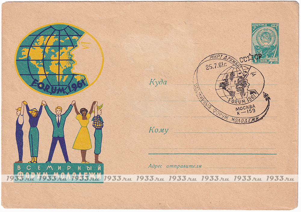 СССР. 1961 ГОД. ПОЧТОВЫЙ КОНВЕРТ СО СПЕЦГАШЕНИЕМ, ПОСВЯЩЁННЫЙ ВСЕМИРНОМУ ФОРУМУ МОЛОДЁЖИ ПРОХОДЯЩЕМУ В МОСКВЕ, В 1961 ГОДУ.
