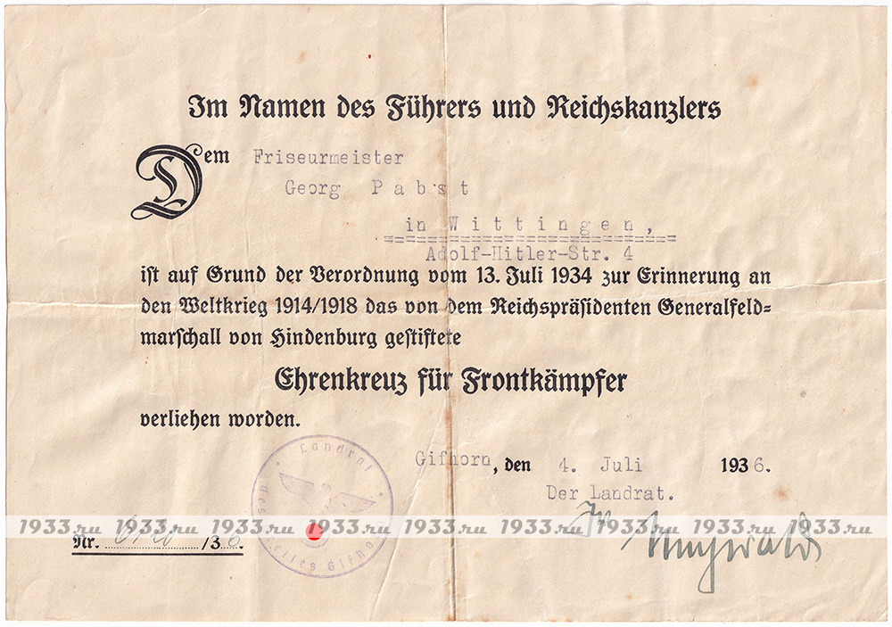 info@1933.ruТРЕТИЙ РЕЙХ. НАГРАДНОЙ ЛИСТ К КРЕСТУ ГИНДЕНБУРГА ДЛЯ ФРОНТОВИКОВ (КОМБАТАНТОВ), С МЕЧАМИ Назад в каталог