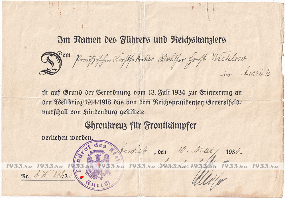 info@1933.ruТРЕТИЙ РЕЙХ. НАГРАДНОЙ ЛИСТ К КРЕСТУ ГИНДЕНБУРГА ДЛЯ ФРОНТОВИКОВ (КОМБАТАНТОВ), С МЕЧАМИ Назад в каталог