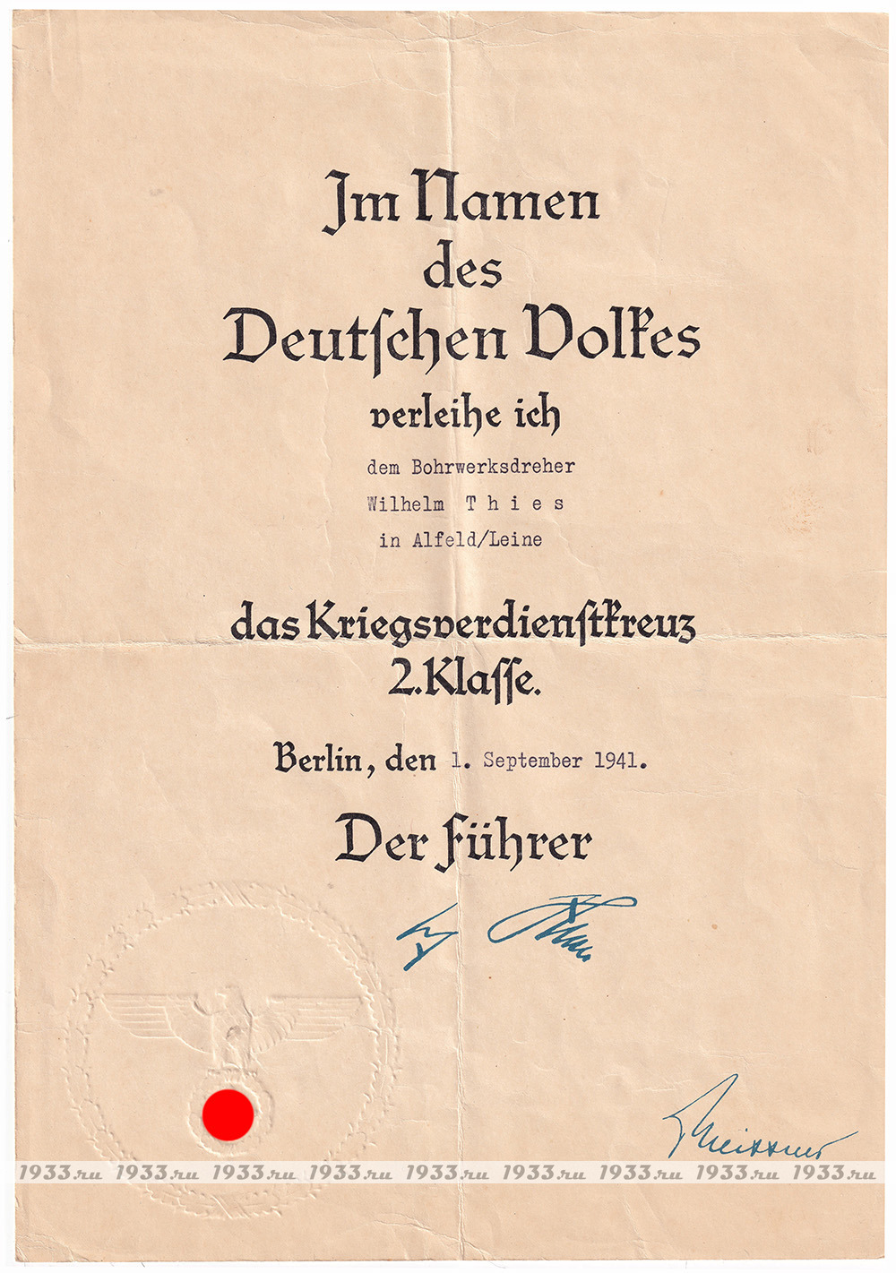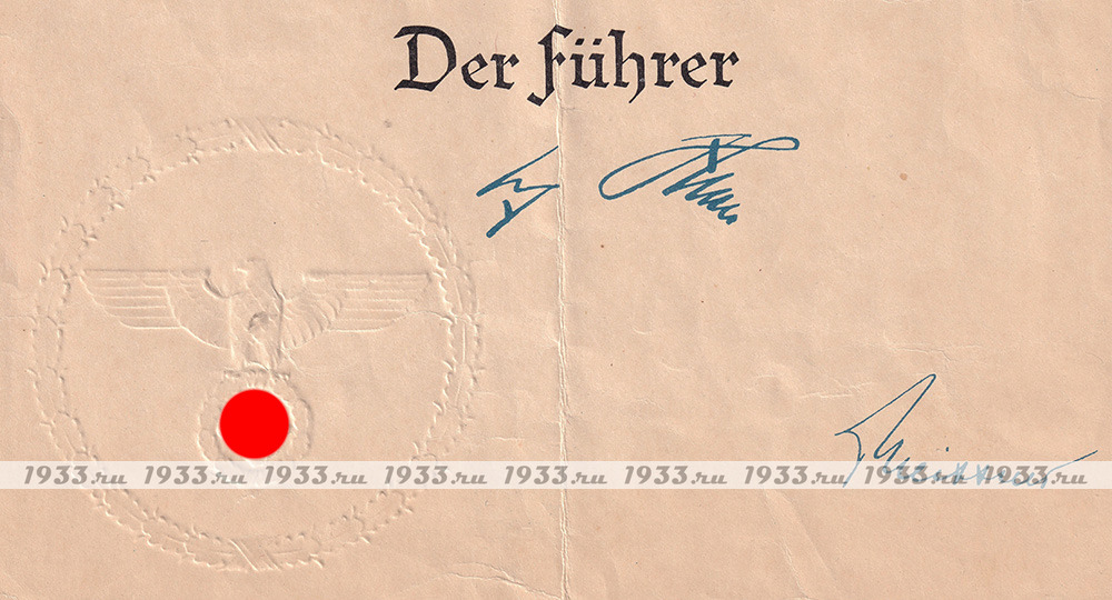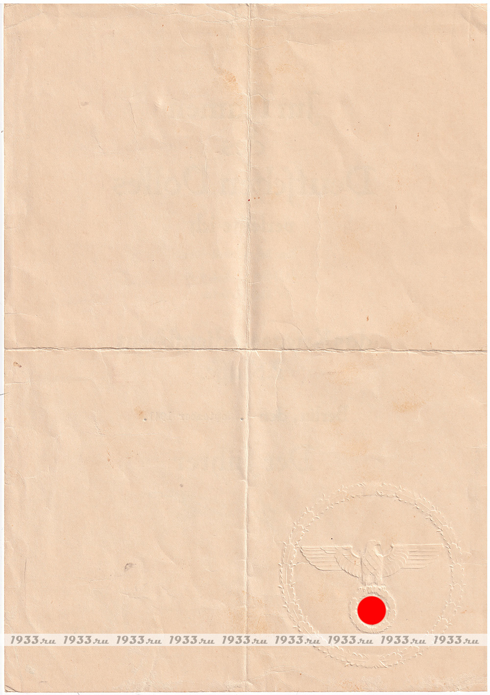 info@1933.ruТРЕТИЙ РЕЙХ. НАГРАДНОЙ ЛИСТ К КРЕСТУ ВОЕННЫХ ЗАСЛУГ 2 КЛАССА (КВК-2), БЕЗ МЕЧЕЙ Назад в каталог