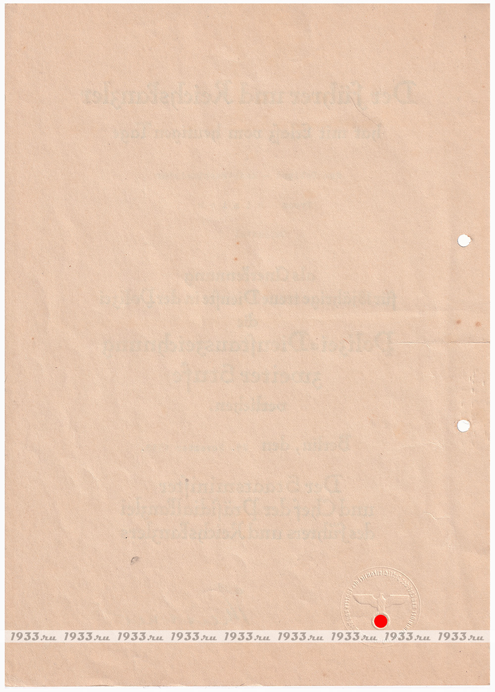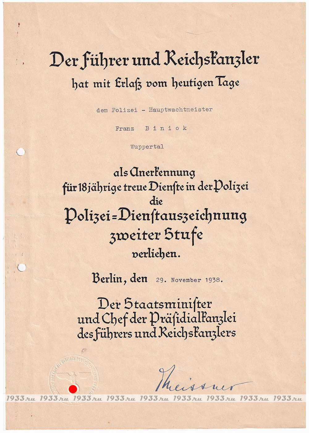 ТРЕТИЙ РЕЙХ. НАГРАДНОЙ ЛИСТ К КРЕСТУ "ЗА 18 ЛЕТ ВЫСЛУГИ В ПОЛИЦИИ".