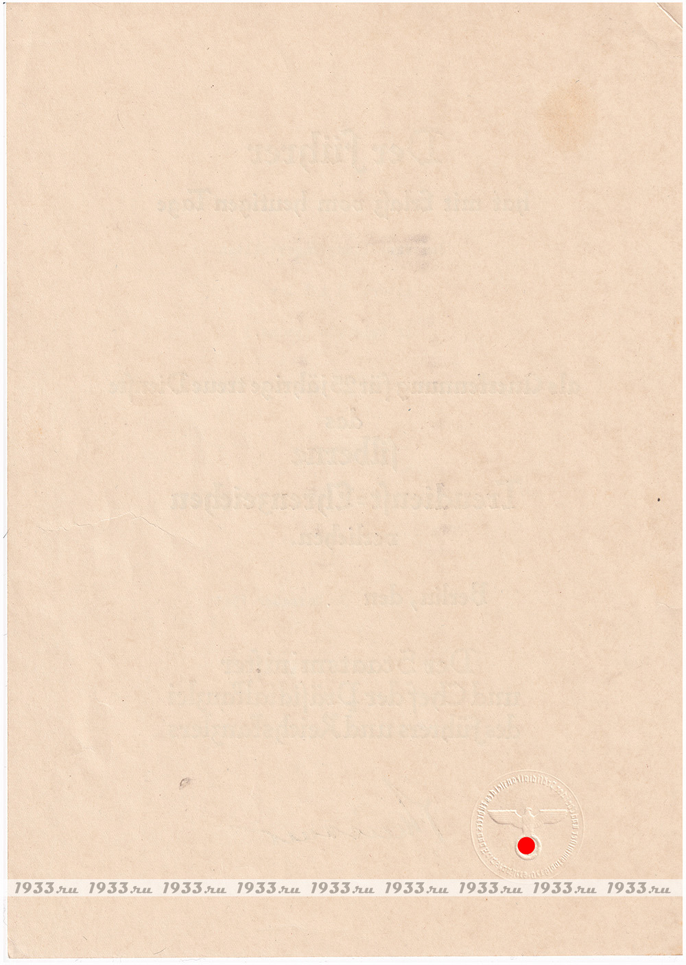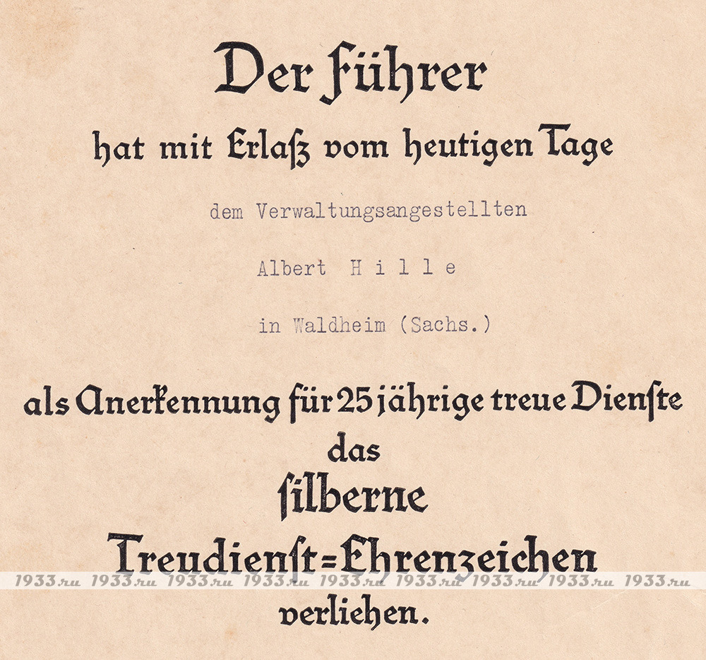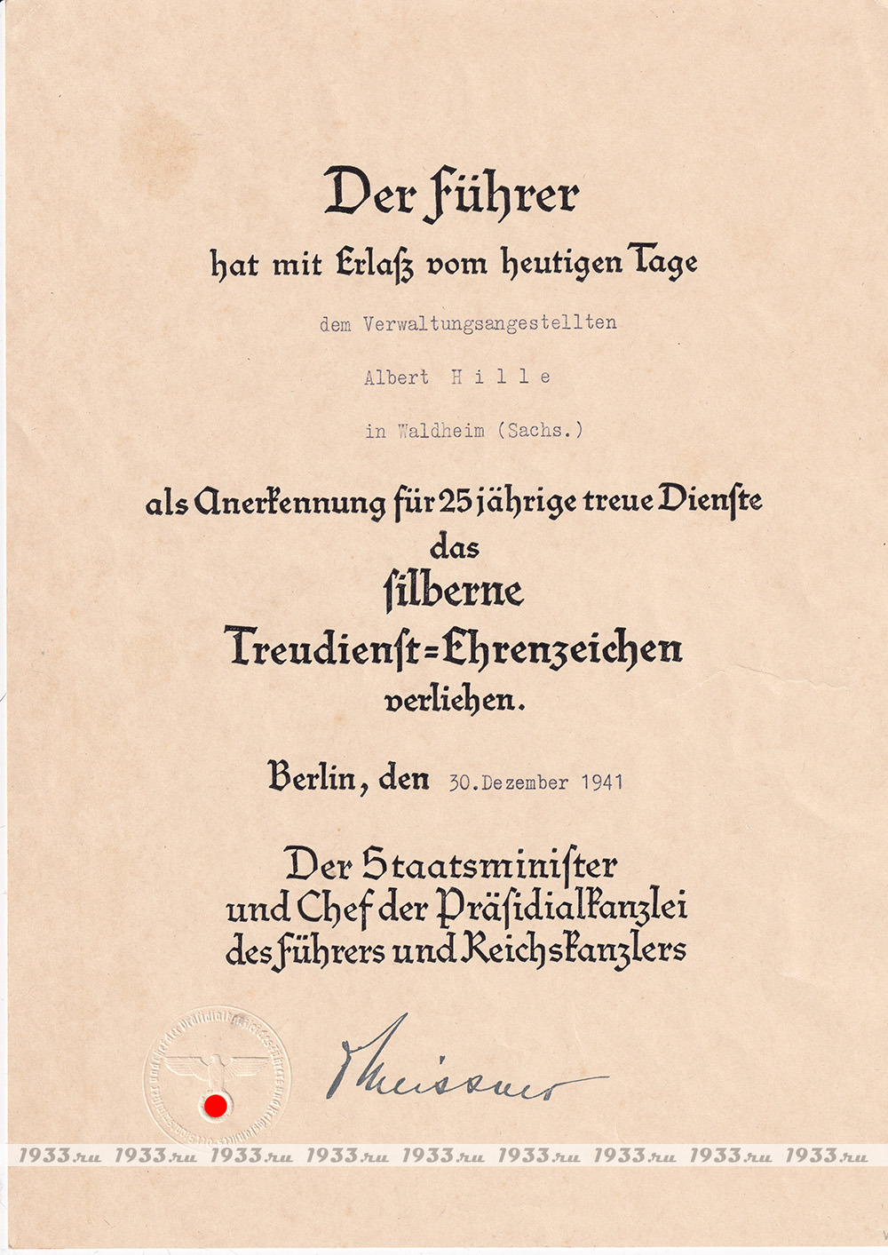 info@1933.ruТРЕТИЙ РЕЙХ. НАГРАДНОЙ ЛИСТ К КРЕСТУ ЗА 25 ЛЕТ ВЫСЛУГИ ДЛЯ ГРАЖДАНСКИХ СЛУЖАЩИХ Назад в каталог