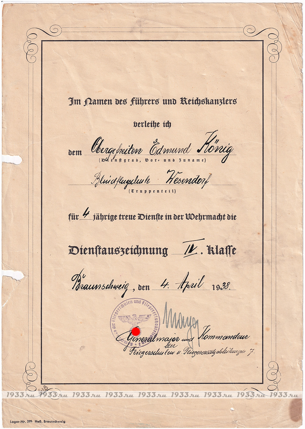 ТРЕТИЙ РЕЙХ. НАГРАДНОЙ ЛИСТ К МЕДАЛИ 4 ГОДА ВЫСЛУГИ В ВЕРМАХТЕ.