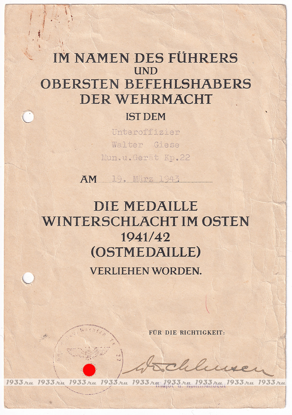 info@1933.ruТРЕТИЙ РЕЙХ. НАГРАДНОЙ ЛИСТ К МЕДАЛИ "МОРОЖЕННОЕ МЯСО" Назад в каталог