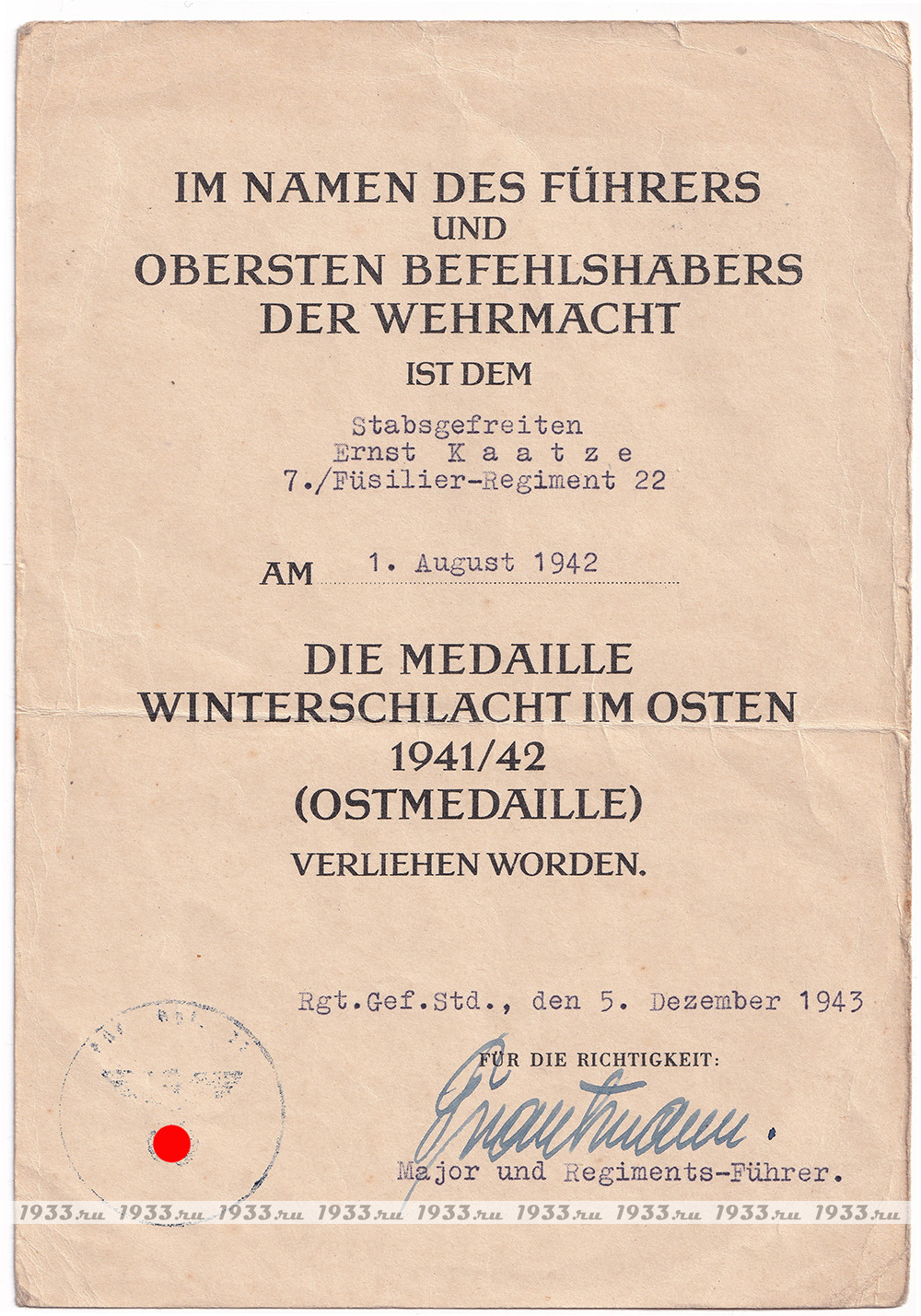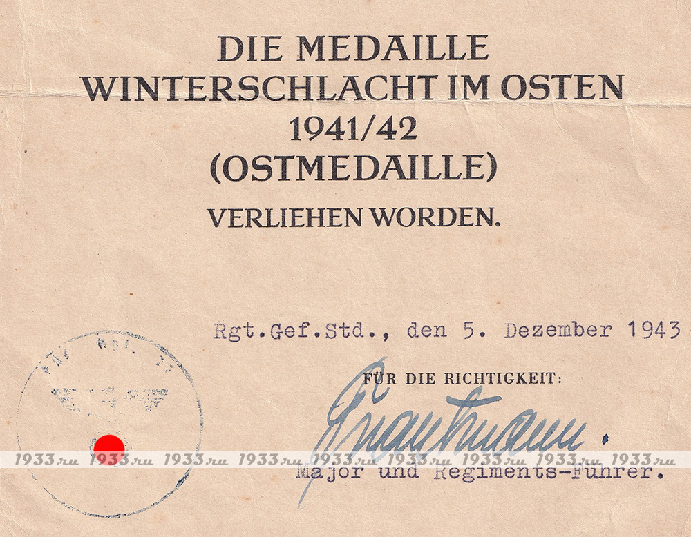 ТРЕТИЙ РЕЙХ. НАГРАДНОЙ ЛИСТ К МЕДАЛИ "ЗА ЗИМНЮЮ КОМПАНИЮ НА ВОСТОКЕ 1941/42 Г.Г." (МОРОЖЕННОЕ МЯСО).
