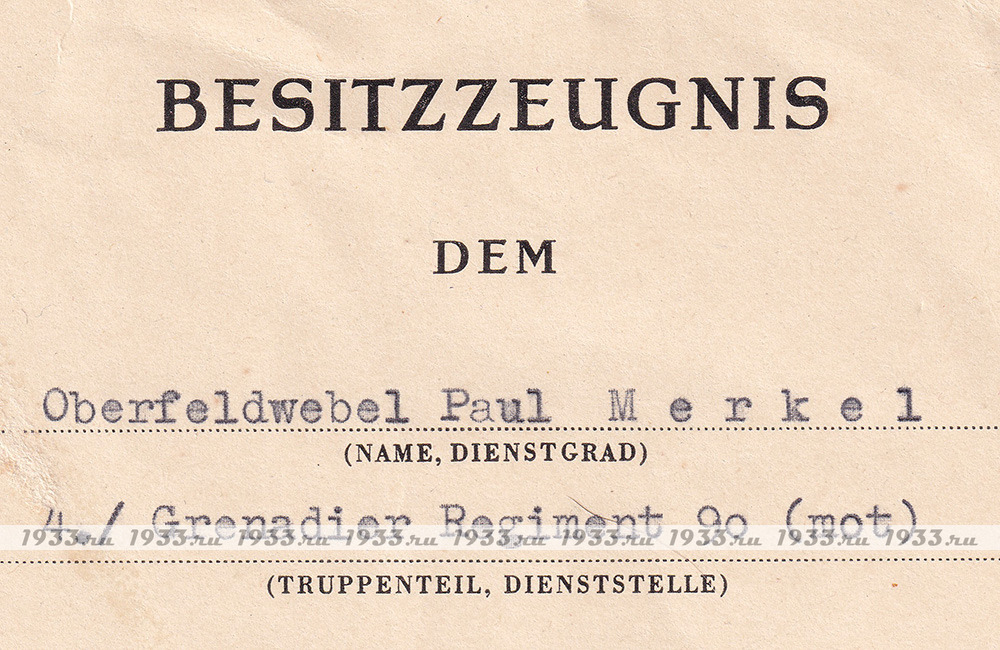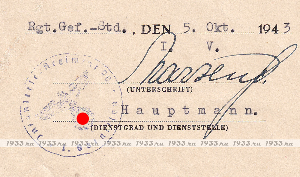 info@1933.ruТРЕТИЙ РЕЙХ. НАГРАДНОЙ ЛИСТ К ЗНАКУ ЧЁРНОЕ РАНЕНИЕ ОБРАЗЦА 1939 Г. Назад в каталог