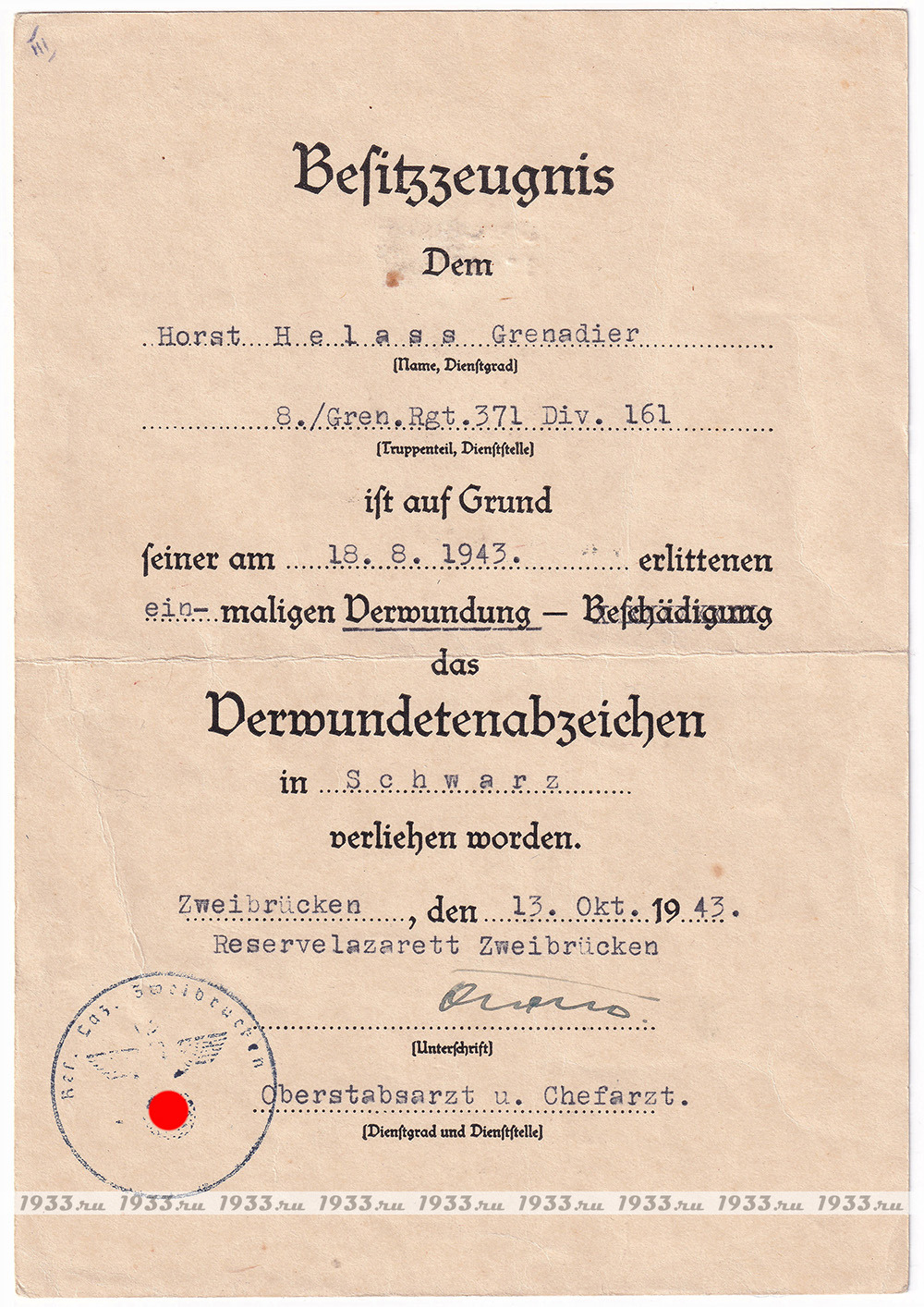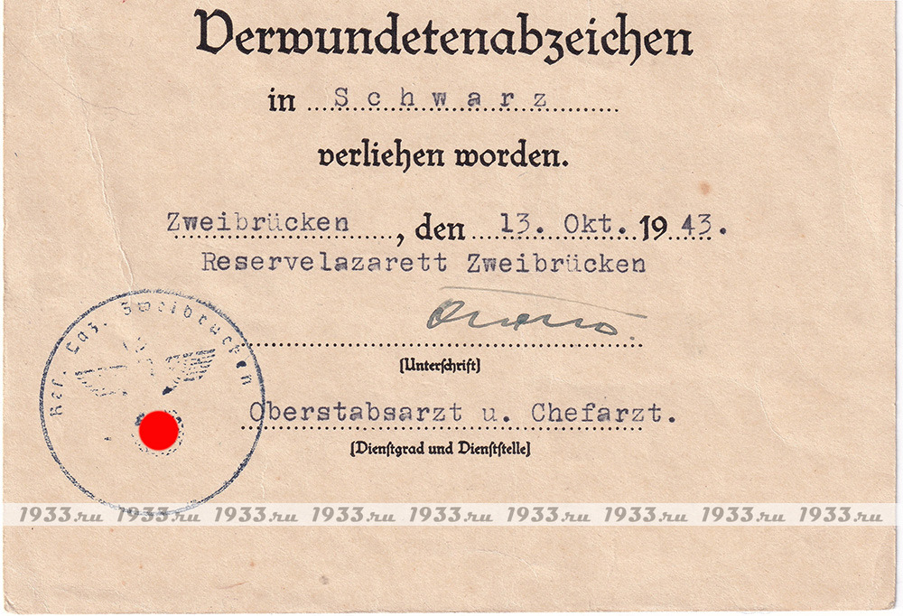 info@1933.ruТРЕТИЙ РЕЙХ. НАГРАДНОЙ ЛИСТ К ЗНАКУ ЧЁРНОЕ РАНЕНИЕ ОБРАЗЦА 1939 ГОДА Назад в каталог
