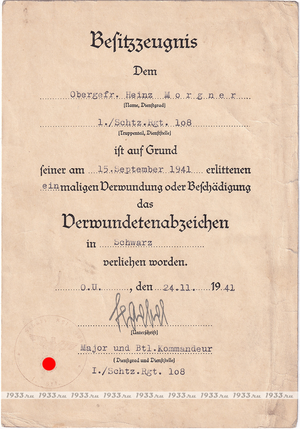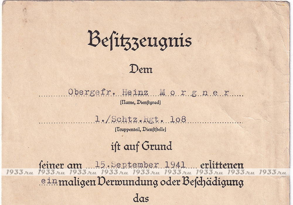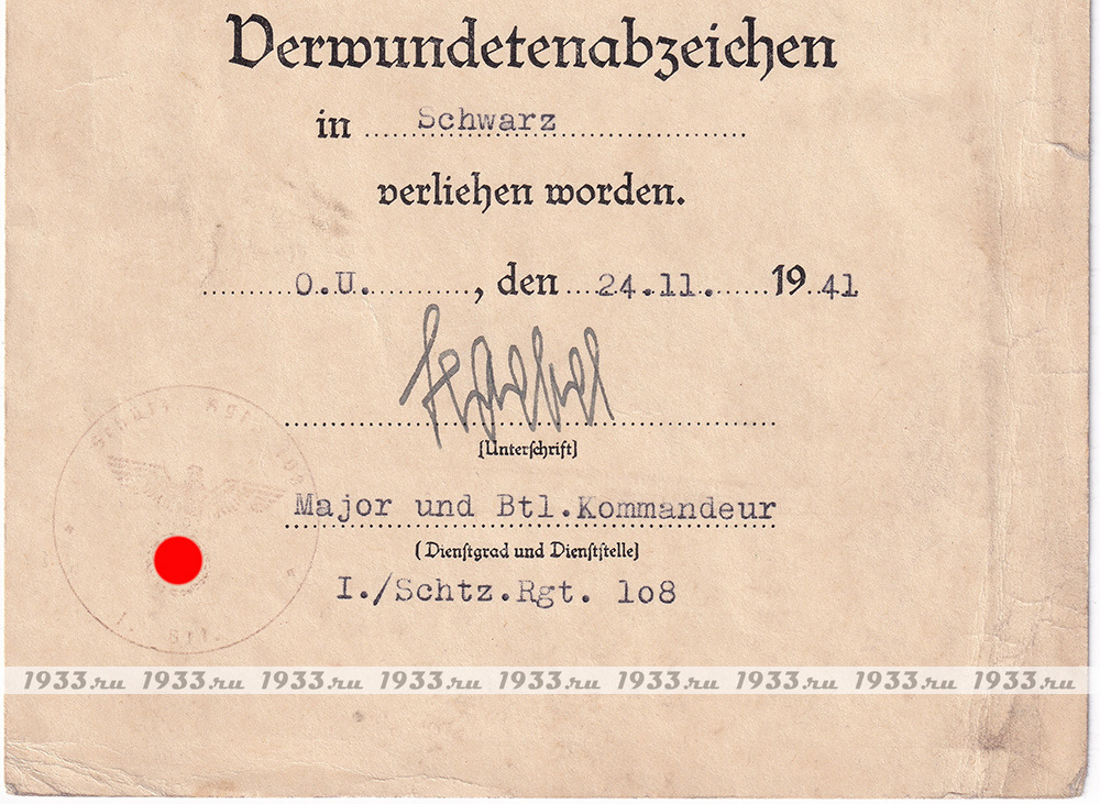 info@1933.ruТРЕТИЙ РЕЙХ. НАГРАДНОЙ ЛИСТ К ЗНАКУ ЧЁРНОЕ РАНЕНИЕ ОБРАЗЦА 1939 ГОДА Назад в каталог