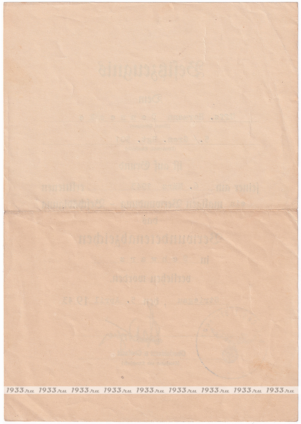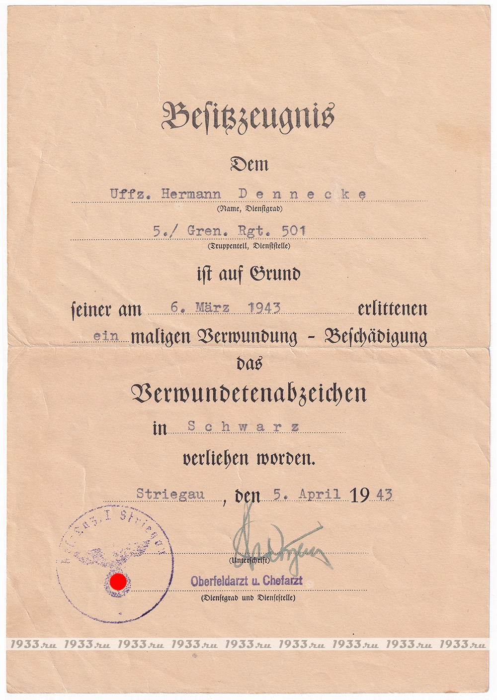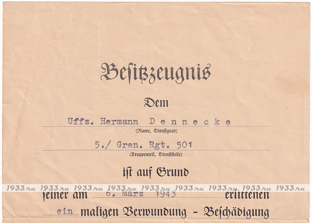 Выдан унтер-офицеру Герману Деннеку из 5 Дивизии 501 гренадерского полка - "За первое ранение полученное 6 марта 1943 года".