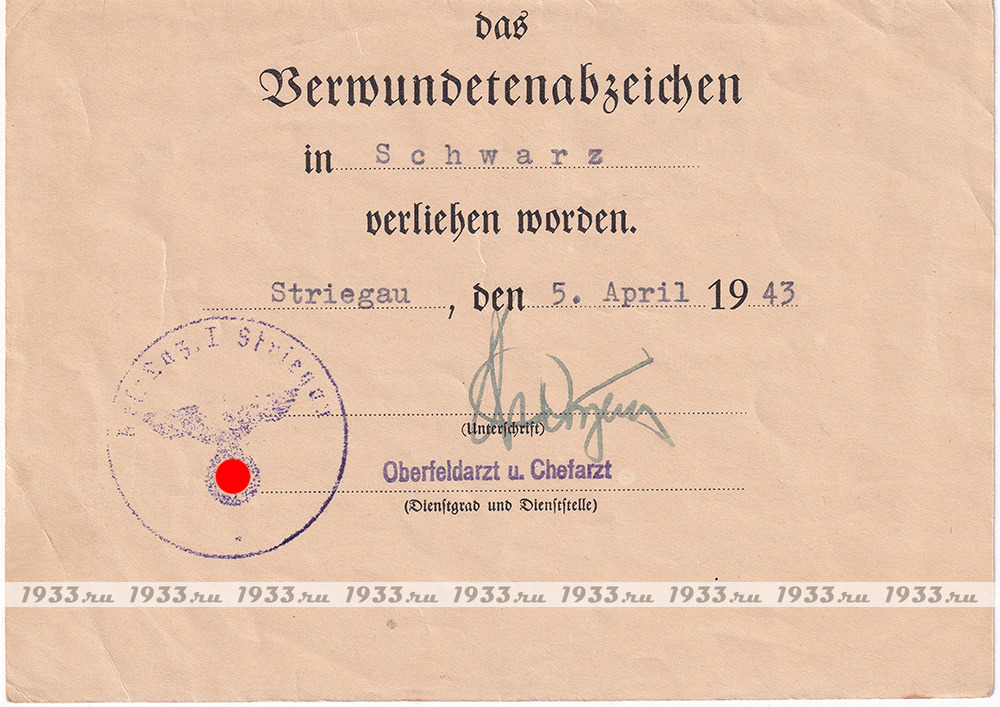 ТРЕТИЙ РЕЙХ. НАГРАДНОЙ ЛИСТ К ЗНАКУ ЧЁРНОЕ РАНЕНИЕ ОБРАЗЦА 1939 ГОДА.