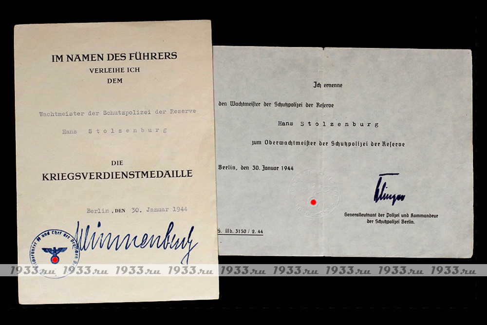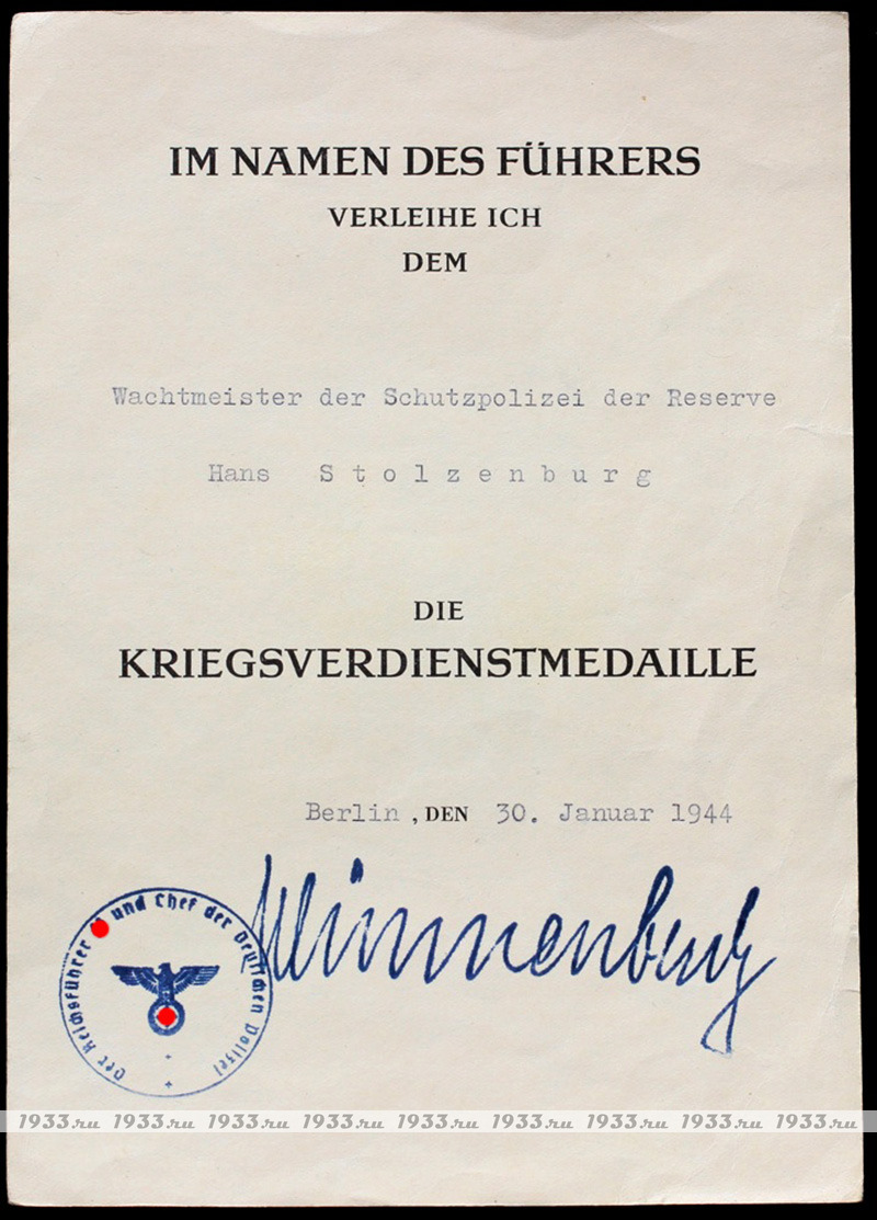 ÒÐÅÒÈÉ ÐÅÉÕ. ÍÀÃÐÀÄÍÎÉ ËÈÑÒ ÍÀ ÌÅÄÀËÜ ÊÂÊ + ÎÔÈÖÈÀËÜÍÎÅ ÈÇÂÅÙÅÍÈÅ Î ÏÐÈÑÂÎÅÍÈÈ ÇÂÀÍÈß ÎÁÅÐÂÀÕÒÌÅÉÑÒÅÐ ÃÀÍÑÓ ÑÒÎËÜÇÅÍÁÓÐÃÓ (Hans Stolzenburg).