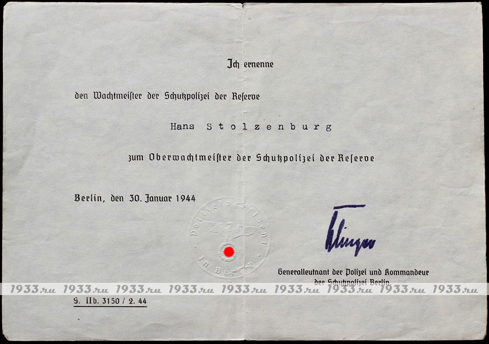 Íàãðàäíîé ëèñò ïîäïèñàí (ôàêñèìèëå) ãåíåðàë-ëåéòåíàíòîì ïîëèöèè è îáåðãðóïïåíôþðåðîì ÑÑ, êîìàíäóþùèì (ñ 8 èþíÿ 1943 ãîäà) IV òàíêîâûì êîðïóñîì ÑÑ - Àëüôðåäîì Áåðíãàðäîì Þëèóñ Ýðíñòîì Âþííåíáåðãîì (íåì. Alfred Bernhard Julius Ernst Wünnenberg). Èçâåùåíèå î ïðèñâîåíèè çâàíèÿ ïîäïèñàë ãðóïïåíôþðåð ÑÑ è ãåíåðàë-ëåéòåíàíò ïîëèöèè Áåðëèíà Îòòî Ýðíñò Êëèíãåð (Ernst Otto Klinger)(25 àïðåëÿ 1886 - 26 èþíÿ 1966).