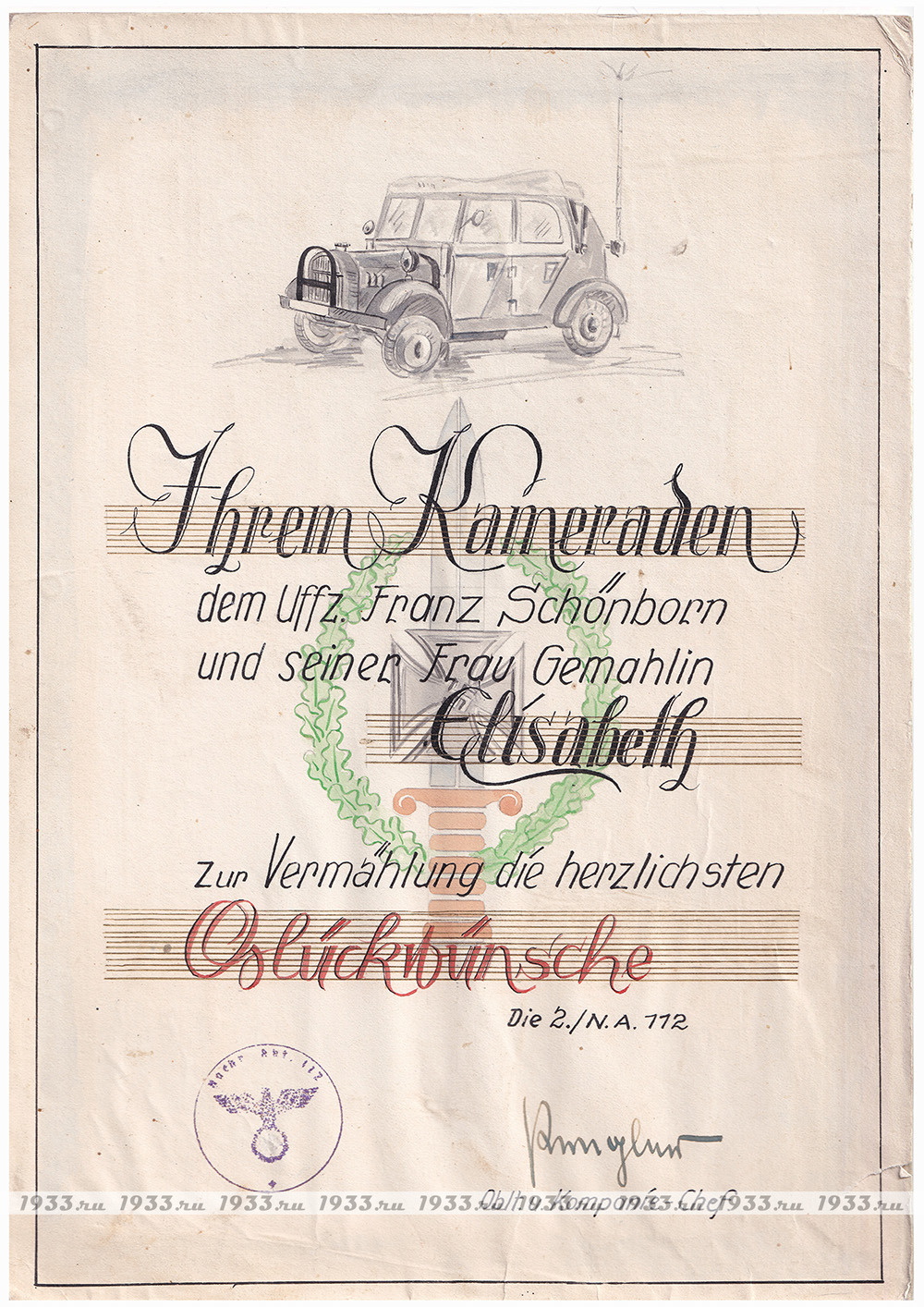 "Сослуживцу унтерофицеру Францу Шёнборну и его супруге Елизабет, наилучшие сердечные поздравления в связи с их бракосочетанием"