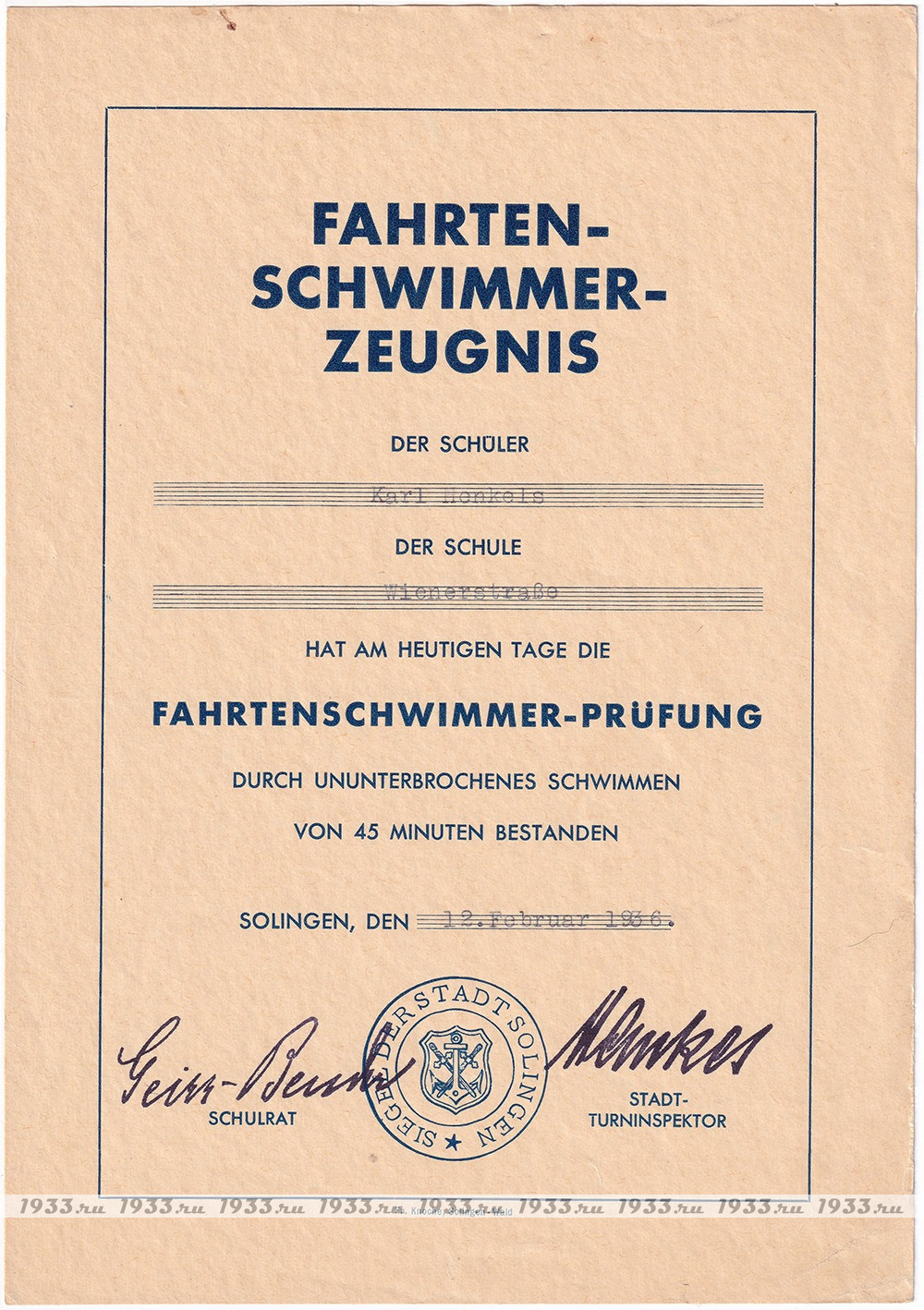 Карл Хенкеле, ученик Школы на Винерштрассе сдал норматив по плаванию "Неприрывное плавание в течение 45 минут".