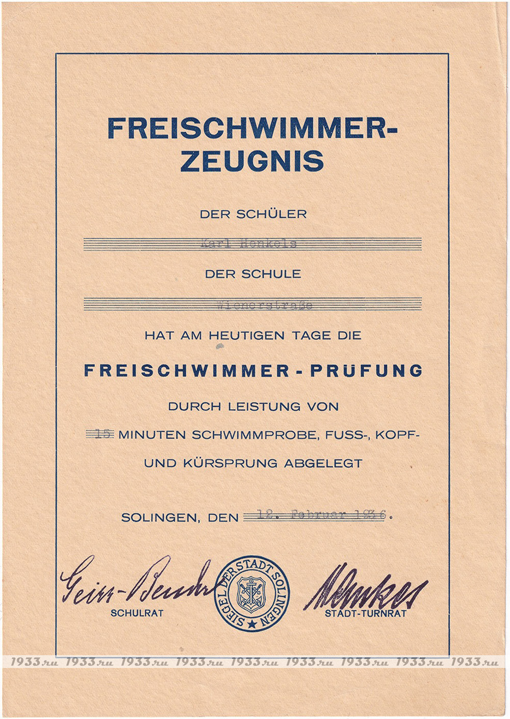 Выдана школьнику Карлу Хенкелю в том, что он выполнил нормативы по плаванию различными стилями, по 15 минут плавания каждым стилем.