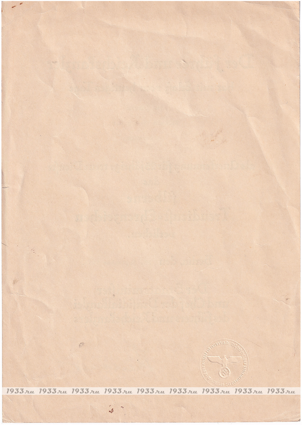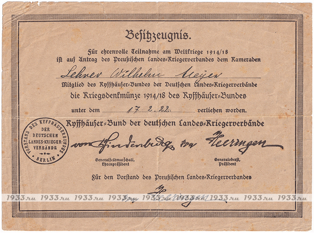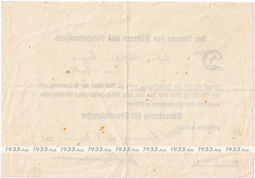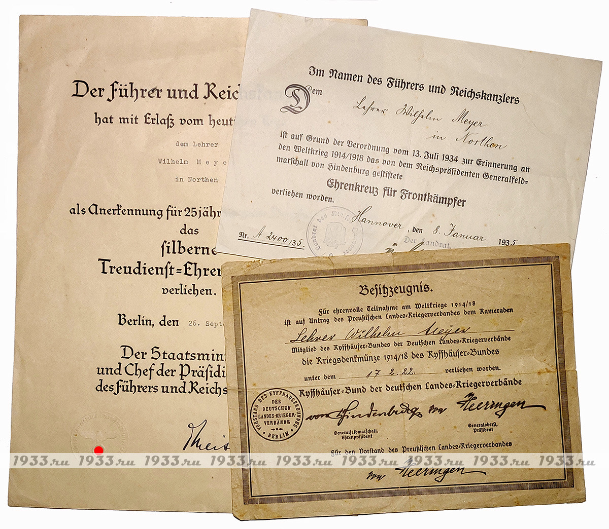 В составе группы: 1-наградной лист к кресту за 25 лет гражданской выслуги; 2-наградной лист к Почётному кресту фронтовиков(Крест Гинденбурга), без мечей; 3-наградной лист к овальной медали Кифхаузербунд.
