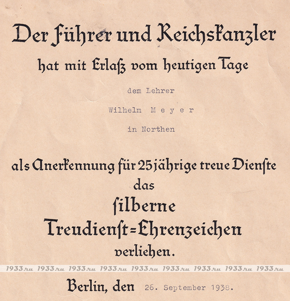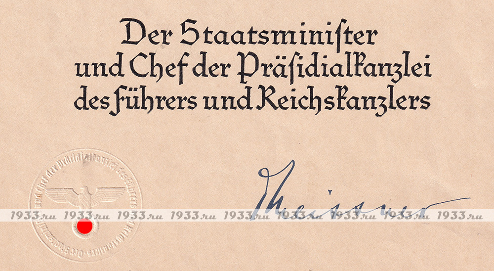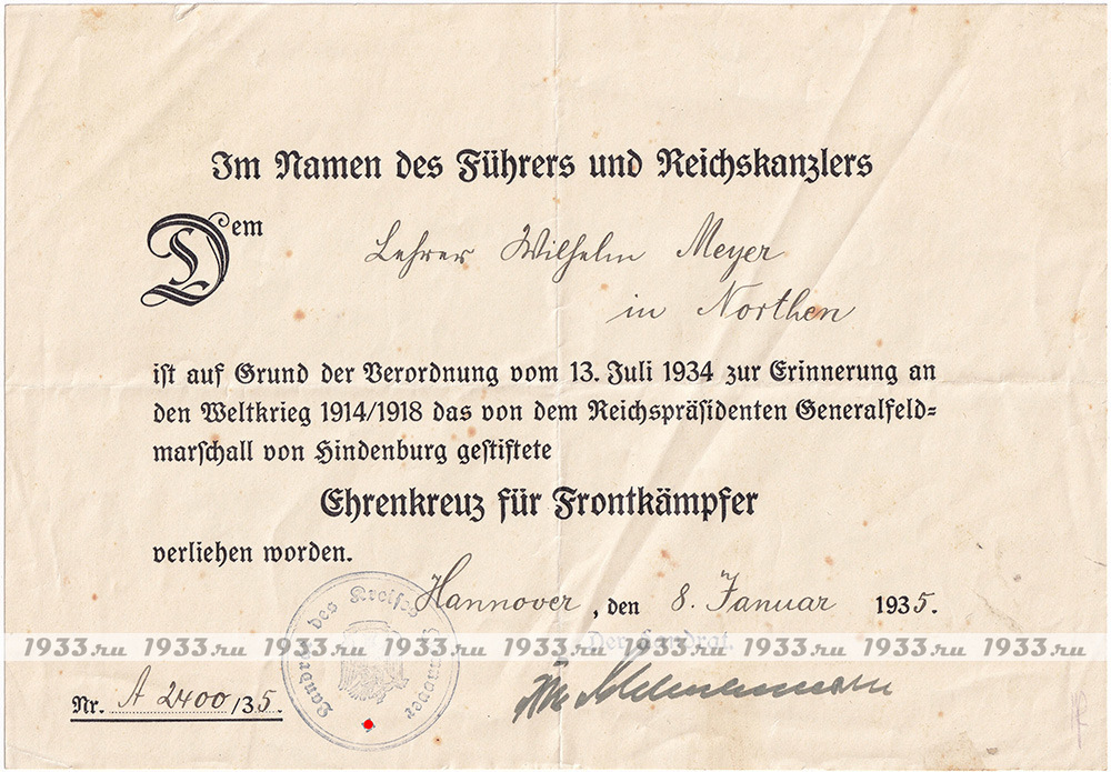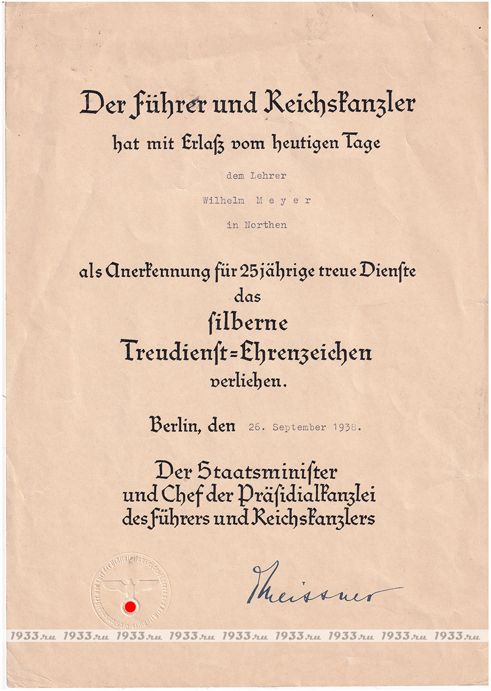 В составе группы: 1-наградной лист к кресту за 25 лет гражданской выслуги; 2-наградной лист к Почётному кресту фронтовиков(Крест Гинденбурга), без мечей; 3-наградной лист к овальной медали Кифхаузербунд.