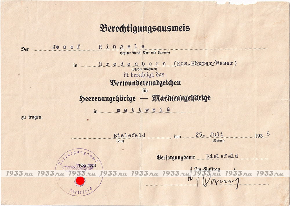 Удостоверение отдела социального обеспечения г. Билифельд, выданное Иосефу Рингеле, проживающему в Бренденборне, округ Хёхстер-Везер, в том, что он имеет право на ношение общеармейского "серебряного"(в тексте дословно - "в белом матовом цвете") знака за ранение. Выдано 25 июля 1936 г. в г.Билифельд. Имеющие ранения имели ряд льгот. Для этого и выдавалась такая справка. Не все ранения признавались Третьим рейхом. Ранения полученные в результате революционных стычек на стороне Веймарской республики или других революционных движений, не признавались. Разрешалось ношение как металлического знака так и тканевого, но в белом матовом цвете. Это отголоски прошлого, когда не писали серебро или золото, а писали белый металл или жёлтый металл.