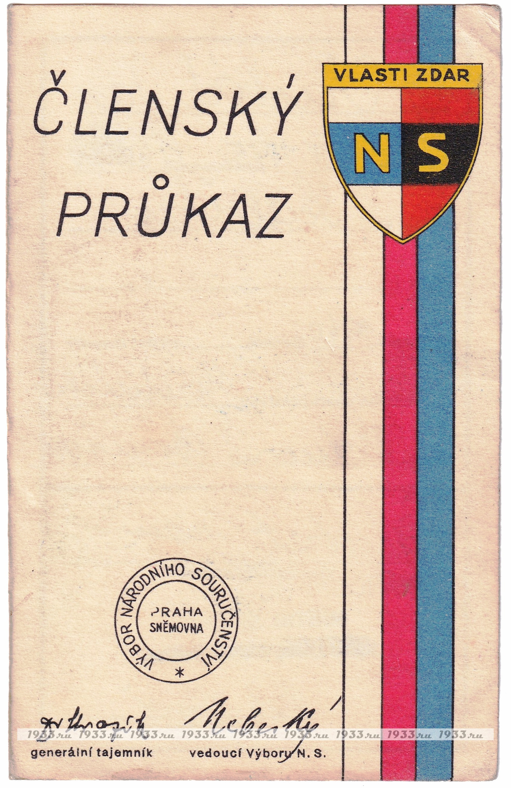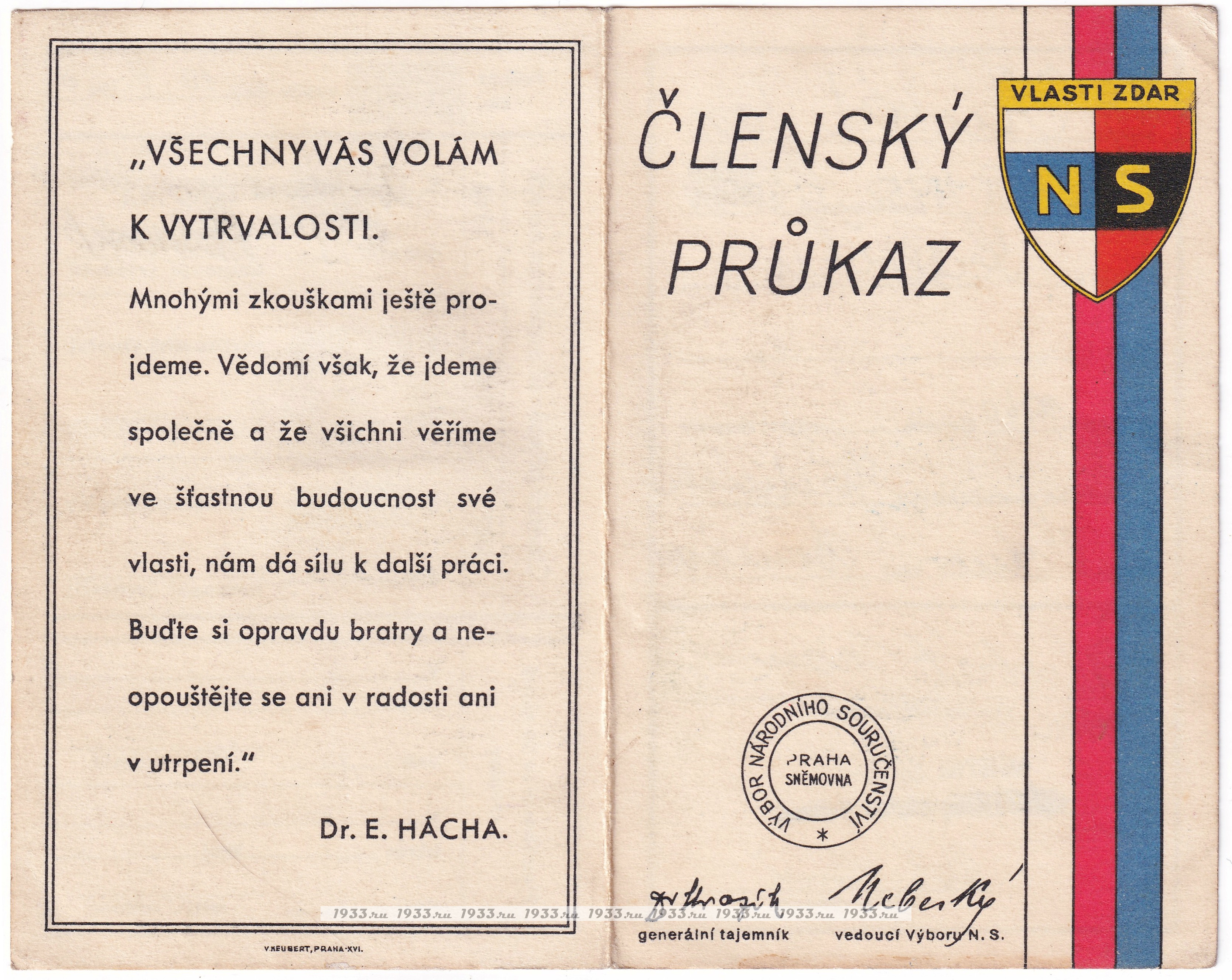 Íàöèîíàë-ñîöèàëèñòè÷åñêèé(NS) ñîþç áûë ñîçäàí â ìàðòå 1939 ãîäà èíèöèàòèâå Ý. Ãàõà ïóòåì ñëèÿíèÿ äâóõ ðàíåå ñóùåñòâóþùèõ ïðîôàøèñòñêèõ ïàðòèé ×åõîñëîâàêèè: Ïàðòèè íàöèîíàëüíîãî åäèíñòâà è Íàöèîíàëüíîé ðàáî÷åé ïàðòèè. NS äîëæåí áûë ñêîíöåíòðèðîâàòü âñå ñóùåñòâóþùèå ïîëèòè÷åñêèå îðãàíèçàöèè, êîòîðûå áûëè âûíóæäåíû çàêðûòüñÿ. Âîçãëàâèë êîìèòåò NS ðóêîâîäèòåëü çàêðûâøåéñÿ Àãðàðíîé ïàðòèè Àäîëüô Âàëîâîé, è â àïðåëå 1939 ãîäà íà÷àë ìàññîâóþ êàìïàíèþ âåðáîâêè âñåãî ÷åøñêîãî ìóæñêîãî íàñåëåíèÿ. ×ëåíàìè Ñîþçà ìîãëè ñòàòü ìóæ÷èíû ñ 21 ãîäà, ÷åøñêîé èëè íåìåöêîé íàöèîíàëüíîñòåé. Ãîñóäàðñòâåííûå ñëóæàùèå ïðàêòè÷åñêè àâòîìàòè÷åñêè ñòàíîâèëèñü ÷ëåíàìè Ñîþçà. Ê êîíöó àïðåëÿ 1939 ãîäà â ñîñòàâå NS ñîþçà ñîñòîÿëî ïî÷òè 97,5 % âñåãî ìóæñêîãî íàñåëåíèÿ Ïðîòåêòîðàòà. Íåîôèöèàëüíûì äåâèçîì ñîþçà ñòàë "Ðîäèíà áëàãîïîëó÷èÿ". Ñ îêòÿáðÿ 1939 ïî ìàé 1941 ãîäà, Ãåñòàïî ïðîâåëî ÷èñòêó àïïàðàòà NS ñîþçà è ðóêîâîäñòâî áûëî çàìåíåíî îòêðûòî ïðîíàöèñòñêèì.