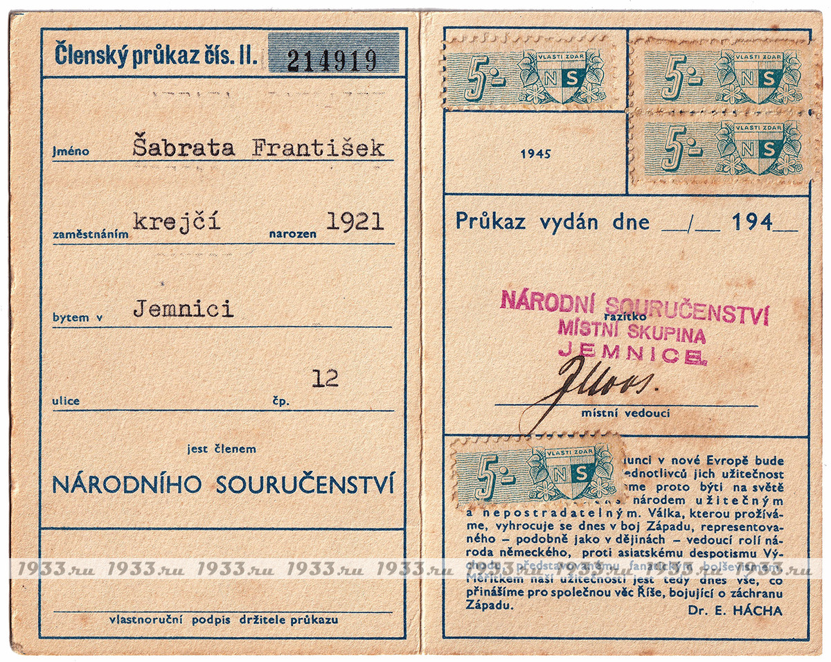 Íàöèîíàë-ñîöèàëèñòè÷åñêèé (NS) ñîþç áûë ñîçäàí â ìàðòå 1939 ãîäà èíèöèàòèâå Ý. Ãàõà ïóòåì ñëèÿíèÿ äâóõ ðàíåå ñóùåñòâóþùèõ ïðîôàøèñòñêèõ ïàðòèé ×åõîñëîâàêèè: Ïàðòèè íàöèîíàëüíîãî åäèíñòâà è Íàöèîíàëüíîé ðàáî÷åé ïàðòèè. NS äîëæåí áûë ñêîíöåíòðèðîâàòü âñå ñóùåñòâóþùèå ïîëèòè÷åñêèå îðãàíèçàöèè, êîòîðûå áûëè âûíóæäåíû çàêðûòüñÿ. Âîçãëàâèë êîìèòåò NS ðóêîâîäèòåëü çàêðûâøåéñÿ Àãðàðíîé ïàðòèè Àäîëüô Âàëîâîé, è â àïðåëå 1939 ãîäà íà÷àë ìàññîâóþ êàìïàíèþ âåðáîâêè âñåãî ÷åøñêîãî ìóæñêîãî íàñåëåíèÿ. ×ëåíàìè Ñîþçà ìîãëè ñòàòü ìóæ÷èíû ñ 21 ãîäà, ÷åøñêîé èëè íåìåöêîé íàöèîíàëüíîñòåé. Ãîñóäàðñòâåííûå ñëóæàùèå ïðàêòè÷åñêè àâòîìàòè÷åñêè ñòàíîâèëèñü ÷ëåíàìè Ñîþçà. Ê êîíöó àïðåëÿ 1939 ãîäà â ñîñòàâå NS ñîþçà ñîñòîÿëî ïî÷òè 97,5 % âñåãî ìóæñêîãî íàñåëåíèÿ Ïðîòåêòîðàòà. Íåîôèöèàëüíûì äåâèçîì ñîþçà ñòàë "Ðîäèíà áëàãîïîëó÷èÿ". Ñ îêòÿáðÿ 1939 ïî ìàé 1941 ãîäà, Ãåñòàïî ïðîâåëî ÷èñòêó àïïàðàòà NS ñîþçà è ðóêîâîäñòâî áûëî çàìåíåíî îòêðûòî ïðîíàöèñòñêèì.