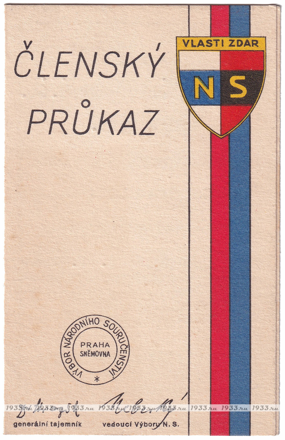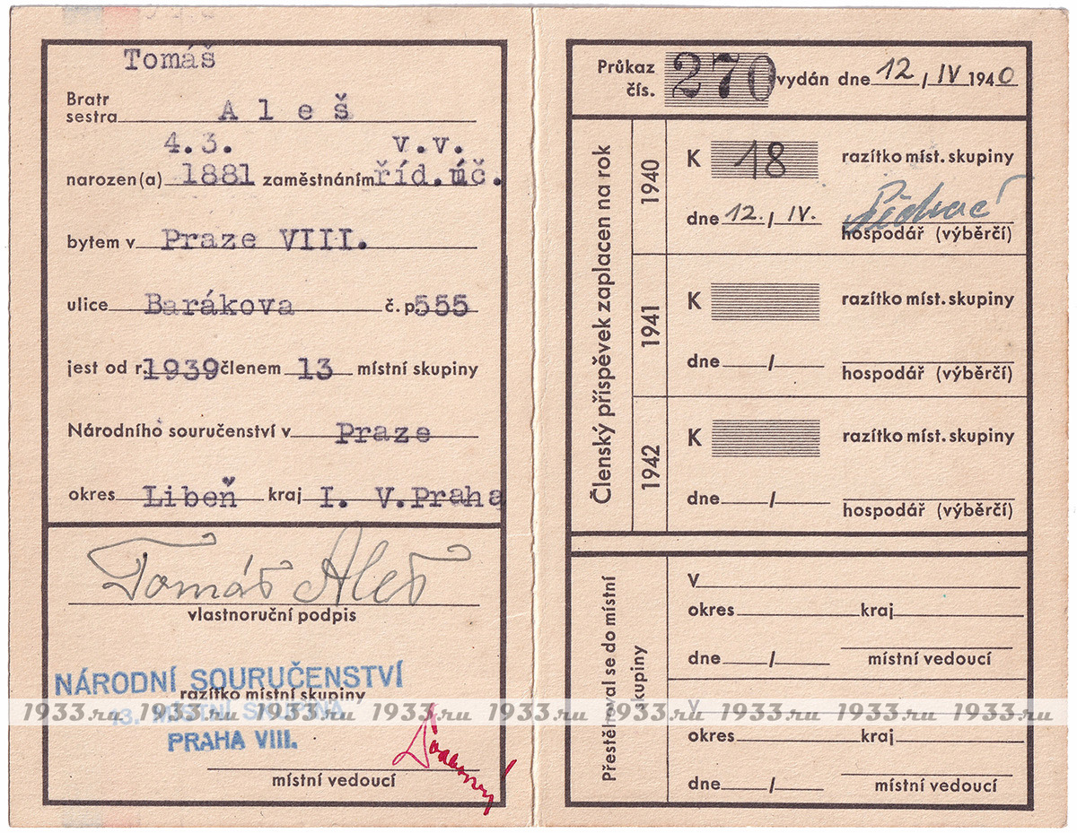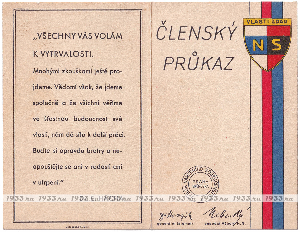 Íàöèîíàë-ñîöèàëèñòè÷åñêèé(NS) ñîþç áûë ñîçäàí â ìàðòå 1939 ãîäà èíèöèàòèâå Ý. Ãàõà ïóòåì ñëèÿíèÿ äâóõ ðàíåå ñóùåñòâóþùèõ ïðîôàøèñòñêèõ ïàðòèé ×åõîñëîâàêèè: Ïàðòèè íàöèîíàëüíîãî åäèíñòâà è Íàöèîíàëüíîé ðàáî÷åé ïàðòèè. NS äîëæåí áûë ñêîíöåíòðèðîâàòü âñå ñóùåñòâóþùèå ïîëèòè÷åñêèå îðãàíèçàöèè, êîòîðûå áûëè âûíóæäåíû çàêðûòüñÿ. Âîçãëàâèë êîìèòåò NS ðóêîâîäèòåëü çàêðûâøåéñÿ Àãðàðíîé ïàðòèè Àäîëüô Âàëîâîé, è â àïðåëå 1939 ãîäà íà÷àë ìàññîâóþ êàìïàíèþ âåðáîâêè âñåãî ÷åøñêîãî ìóæñêîãî íàñåëåíèÿ. ×ëåíàìè Ñîþçà ìîãëè ñòàòü ìóæ÷èíû ñ 21 ãîäà, ÷åøñêîé èëè íåìåöêîé íàöèîíàëüíîñòåé. Ãîñóäàðñòâåííûå ñëóæàùèå ïðàêòè÷åñêè àâòîìàòè÷åñêè ñòàíîâèëèñü ÷ëåíàìè Ñîþçà. Ê êîíöó àïðåëÿ 1939 ãîäà â ñîñòàâå NS ñîþçà ñîñòîÿëî ïî÷òè 97,5 % âñåãî ìóæñêîãî íàñåëåíèÿ Ïðîòåêòîðàòà. Íåîôèöèàëüíûì äåâèçîì ñîþçà ñòàë "Ðîäèíà áëàãîïîëó÷èÿ". Ñ îêòÿáðÿ 1939 ïî ìàé 1941 ãîäà, Ãåñòàïî ïðîâåëî ÷èñòêó àïïàðàòà NS ñîþçà è ðóêîâîäñòâî áûëî çàìåíåíî îòêðûòî ïðîíàöèñòñêèì.