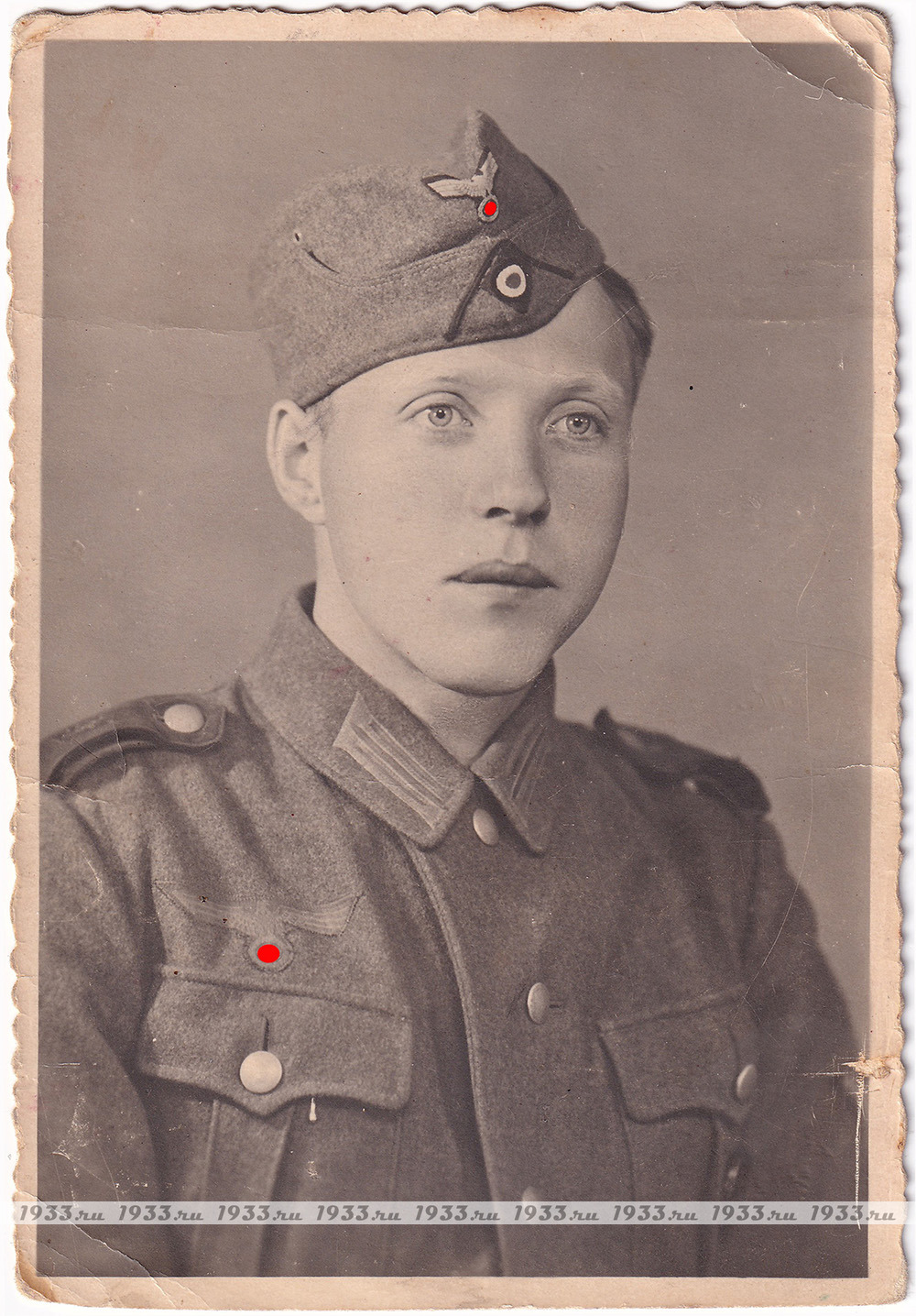 info@1933.ruТРЕТИЙ РЕЙХ. ФОТОПОРТРЕТ РЯДОВОГО ВЕРМАХТА В ПИЛОТКЕ И С "ЧЁРНЫМ" ЗНАКОМ ЗА РАНЕНИЕ Назад в каталог