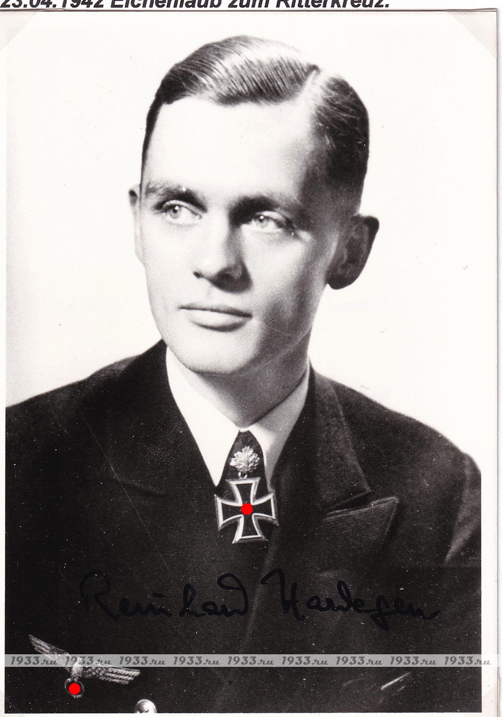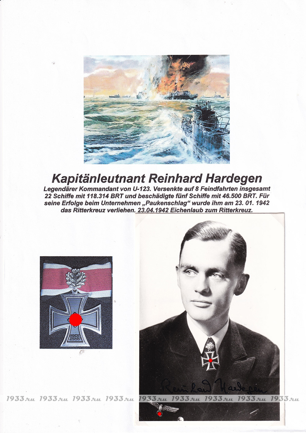 Reinhard Hardegen - родился 18.03.1913 город Бремен жив до настоящего времени. Служба: В апреле 1933 поступил на службу в ВМФ. 01.07.1934 произведен в фенрихи, 01.10.1936 – в лейтенанты. В середине 1935 перешел в морскую авиацию, получил подготовку пилота-разведчика, а затем и пилота истребительной авиации. В мае 1939 самолет Хардегена потерпел крушение, и после длительного лечения он в ноябре 1939 был переведен в подводный флот. Сначала служил на подлодке U-124, которой командовал Г. Шульц. 11.12.1940 назначен командиром подлодки U-147. Совершил на ней только один боевой поход, продолжавшийся 19 дней, в ходе которого потопил норвежский корабль "Аугвальд" (водоизмещением 4811 т). 19.05.1941 получил подлодку U-123 , на которой совершил 4 похода. В 1-м походе к берегам Западной Африки Хардеген потопил 5 кораблей общим водоизмещением 21507 т. В октябре 1941 торпедировал британский вспомогательный крейсер "Аурания" (13984 т), повреждения оказались не критачными и крейсер добрался до порта. В начале 1942 участвовал в проведении операции "Паукеншлаг" около берегов США. В ходе этой операции Хардеген в течении двух недель потопил 8 кораблей общим водоизмещением 49421 т и повредил 1 корабль водоизмещением 8206 т, став одним из наиболее результативных участников операции. Во время следующего похода снова к берегам США Хардеген потопил 8 кораблей (водоизмещением 39917 т) и повредил 3 корабля общим водоизмещением 24310 т, за что . В конце мая 1942 лодка вернулась в Киль, а 31.07.1942 Хардеген сдал командование и был назначен инструктором 27-й флотилии подводных лодок. В марте 1943 назначен начальником подготовки подводников в торпедной школе в Мюрвике. Затем Хардеген служил в управлении торпедного вооружения ОКМ, а в феврале 1945 принял командование батальоном 6-го морского пехотного полка. Всего за время военных действий Хардеген потопил 22 корабля общим водоизмещением 115656 т и повредил 5 кораблей водоизмещением 46500 т. В мае 1945 интернирован британскими войсками. В ноябре 1946 освобожден. После войны успешно занимался бизнесом, а затем был избран членом Бундестага от Бремена и оставался депутатом на протяжении 32 лет. Жив по настоящее время. НАГРАДЫ: Железный крест 2-го класса - 18 сентября 1940; Нагрудный знак подводника - 18 ноября 1940; Железный крест 1-го класса - 23 августа 1941; Рыцарский крест - 23 января 1942; Дубовые Листья - 23 апреля 1942; Нагрудный знак подводника с бриллиантами - 7 мая 1942.
