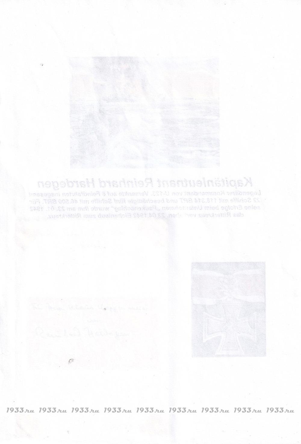 ТРЕТИЙ РЕЙХ. РЕПРОФОТОГРАФИЯ КАВАЛЕРА РЫЦАРСКОГО КРЕСТА С ДУБОВЫМИ ЛИСТЬЯМИ КОРВЕТЕНКАПИТАНА РЕЙНХАРДА ХАРДЕГЕНА (REINHARD HARDEGEN) С АВТОГРАФОМ КАВАЛЕРА.